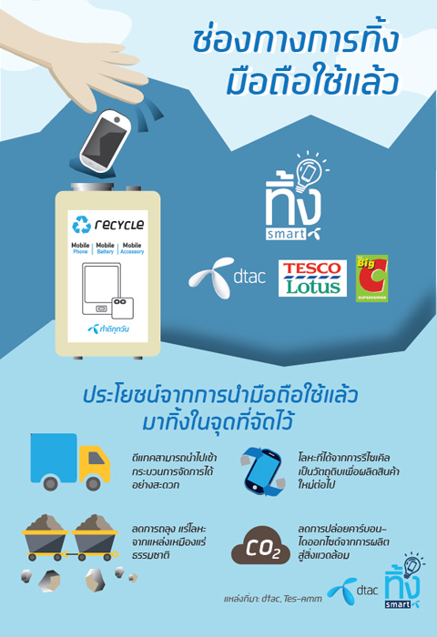 Total Access Communication PLC. or dtac partners up with TES-AMM (Thailand) Co. Ltd. to launch ‘Think Smart’ project, that encourages people to properly manage the electronic waste by bringing old mobile phones including batteries and accessories into designated boxes provided by dtac. dtac will later collect and deliver them to TES-AMM for appropriate disposal and recycling.