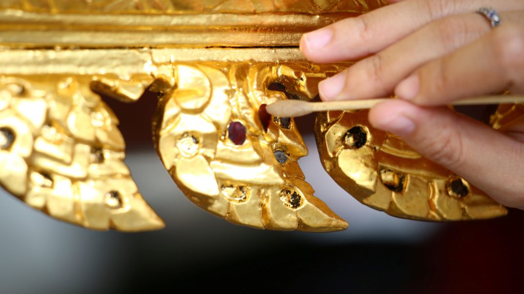 นางยุนีย์ ธีระนันท์ หัวหน้ากลุ่มงานช่างปิดทองประดับกระจกและช่างสนะไทย สำนักช่างสิบหมู่ กรมศิลปากร กล่าวว่า “สำนักช่างสิบหมู่ได้รับหน้าที่ในการดูแลบูรณะซ่อมแซมราชรถน้อย นช.539 ซึ่งจัดแสดง ณ พิพิธภัณฑสถานแห่งชาติ พระนคร และเมื่อเวลาผ่านไปนานราชรถน้อยก็มีการชำรุดหรือศิลปกรรมที่ประดับอยู่หลุดหาย จึงต้องมีการบูรณะซ่อมแซมเพื่อให้โครงสร้างแข็งแรง และลวดลายที่หายไปกลับมาเหมือนเดิมทว่ากระจกสำหรับประดับที่มีขายตามท้องตลาดนั้นมีสีที่มีความสว่างมาก และผลิตมาเพื่อใช้กับกาวอีพ็อกซี่เท่านั้น เมื่อเรานำมาบูรณะซ่อมแซมศิลปวัตถุอย่างถูกวิธี เราจะต้องเลือกใช้วัสดุดั้งเดิมคือ สมุก ซึ่งเป็นการใช้ยางรัก ผงกะลา และใบตองเผา มาผสมและคน นวดให้เหนียว เพื่อใช้เป็นกาวหรือตัวประสานกระจกกับชิ้นงานให้ติดกัน กระจกปัจจุบันไม่สามารถใช้ร่วมกับสมุกได้ และมีความหนาและความบางที่ไม่เหมือนกระจกเดิม”
