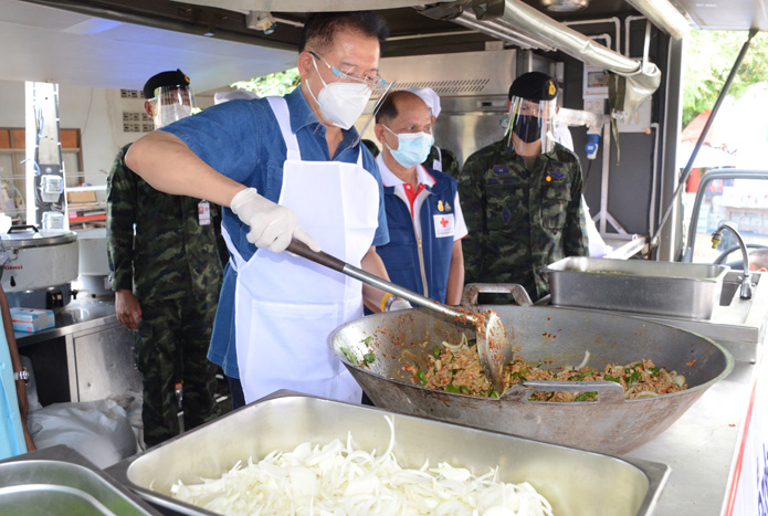 ต่อมาเวลา 14.00 น.นายวิเชียร จันทรโณทัย ผู้ว่าราชการจังหวัดนครราชสีมา ได้เดินทางต่อไปที่บ้านหนองแหน และบ้านหนองแหนพัฒนา ริมถนนมิตรภาพ ต.ธารปราสาท อ.โนนสูง จ.นครราชสีมา เพื่อตรวจเยี่ยมและให้กำลังใจเจ้าหน้าที่ที่ปฏิบัติงานช่วยเหลือประชาชนที่ถูกกักตัว พร้อมลงมือประกอบอาหารผัดกระเพราหมูสับหอมหัวใหญ่ราดข้าวไข่ดาว จำนวน 200 กล่องให้แก่ประชาชน ซึ่งในพื้นที่ อ.โนนสูงมีผู้ติดเชื้อ 26 ราย รักษา หายแล้ว 7 ราย