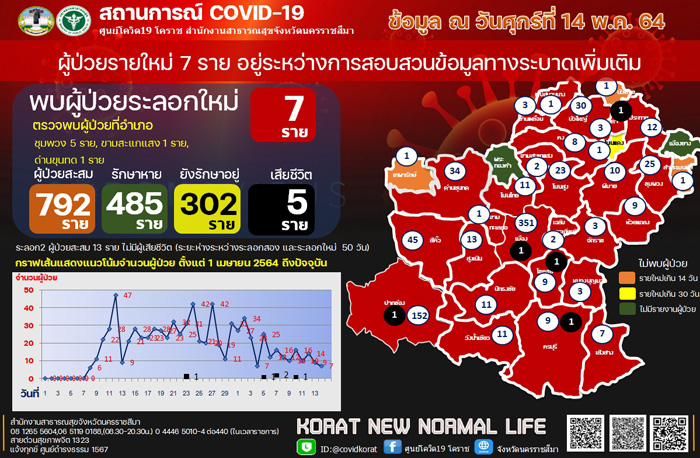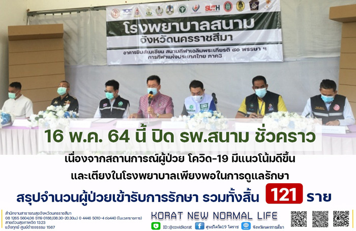 นายวิเชียร จันทรโณทัย ผู้ว่าราชาการจังหวัดนครราชสีมา เปิดเผยว่า สถานการณ์การแพร่ระบาดของไวรัสโควิด-19มียอดผู้ติดเชื้อลดลง วันนี้พบผู้ติดเชื้อรายใหญ่ 7ราย พบใน อ.ชุมพวง 5ราย มาจากคลัสเตอร์ โรงงานกุนเชียง พบใน อ.ขามสะแกแสง 1 ราย และ อ.ด่านขุนทด 1 ราย รวมมีผู้ป่วยสะสม 792 ราย รักษาหาย 485 ราย ยังรักษา 302 ราย เสียชีวิต 5 รายส่วนโรงพยาบาลสนาม มีผู้ป่วย 9 ราย แบ่งเป็นชาย 4 ราย หญิง 5 รายคงเหลือเตียงว่างใน รพ.สนาม 191 เตียงวางแผนปิด รพ.สนาม เป็นการชั่วคราว ในวันที่ 16 พ.ค. 64 เนื่องจากสถานการณ์ผู้ติดเชื้อรายใหม่ น้อยลงและเตียงใน รพ. มีเพียงพอในการดูแลรักษาผู้ป่วยโดยไม่มีการย้ายของกลับ และเรื่องการจัดเวรบุคลากร จะให้เป็นแบบ สแตนบายไปอีกระยะหนึ่ง ทั้งนี้เพื่อให้รพ.สนามพร้อมเปิดดำเนินงานได้ทันทีในกรณีที่สถานการณ์การระบาดรุนแรงขึ้น