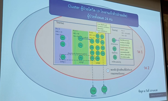 สำหรับการกระบาดในโรงงานที่ 2 ผู้ป่วยรายที่ 782 ที่เพิ่งเจอเชื้อในวันนี้ (14 พ.ค.) เป็นรายสำคัญมากโดยเป็นชาว อ.ด่านขุนทด ซึ่งทำหน้าที่เป็นเจ้าพนักงานอนามัยในการตรวจร่างกาย ตรวจความเรียบร้อยตรวจเล็บ ตรวจผมและตรวจความเรียบร้อยของชุดทำงานพนักงานทุกคนก่อนให้เข้าในพื้นที่บรรจุภัณฑ์ซึ่งมีการสัมผัสกับทุกคน ตอนแรกคนนี้คิดว่าตัวเองไม่เสี่ยงเลยจึงไม่เคยตรวจ แต่ทางโรงงานแจ้งกับพนักงานว่า ถ้าจะเปิดโรงงานในวันที่ 15 พ.ค.นี้พนักงานทุกคนจะต้องไปตรวจร่างกายและเอาผลมายืนยันก่อนจึงไปตรวจและพบเชื้อซึ่งมีค่ากระจายเชื้อค่อนข้างสูง โดยการไปตรวจนั้นทางโรงงานได้ใช้รถตู้พาพนักงานไปตรวจและเวียนรับพนักงานประมาณ 40 คนไปตรวจซึ่งมีหลายแผนกที่ไปตรวจพร้อมกันและโดยสารรถคันเดียวกันจึงเป็นเรื่องที่น่าห่วง โดยคลัสเตอร์นี้มีกระจายไปทั้ง 5 อำเภอ อ.เมืองมากสุด ด่านขุนทด , ชุมพวง , สูงเนิน , ขามทะเลสอ การตรวจเชื้อวันแรกจะไม่พบส่วนมากจะพบเป็นวันที่ 5 และ การเข้าไปตรวจสอบพนักงานที่สัมผัสเสี่ยงสูงทำค่อนข้างยากเพราะพนักงานที่นี้มี 800 คน ทำงานเป็นรายวันที่ไม่ได้ขึ้นอยู่ในทะเบียนของโรงงาน