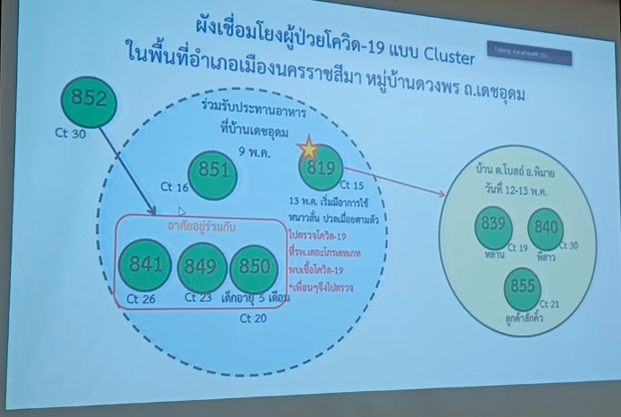 วันนี้ (21 พ.ค. 2564) ที่ประชุมคณะกรรมการโรคติดต่อจังหวัดนครราชสีมา ได้มีการเปิดเผย"คลัสเตอร์ใหม่” ที่น่าจับตามองและเฝ้าระวังอยู่ในพื้นที่เขตอำเภอเมือง หมู่บ้านดวงพร ถนนเดชอุดม มีผู้ป่วยโควิด-19 ทั้งหมด 9 ราย คือ รายที่ 819, 849 ,850 851 ,841, 855, 840 ,839 และ 852 โดยรายแรก คือ รายที่ 819 มีอาการหนาวสั่น มีไข้ ปวดเมื่อยร่างกาย เมื่อวันที่ 13 พ.ค.2564 จากนั้นได้เข้าไปตรวจหาเชื้อ และรู้ผลวันที่ 19 พ.ค.2564 ว่าติดเชื้อโควิด-19