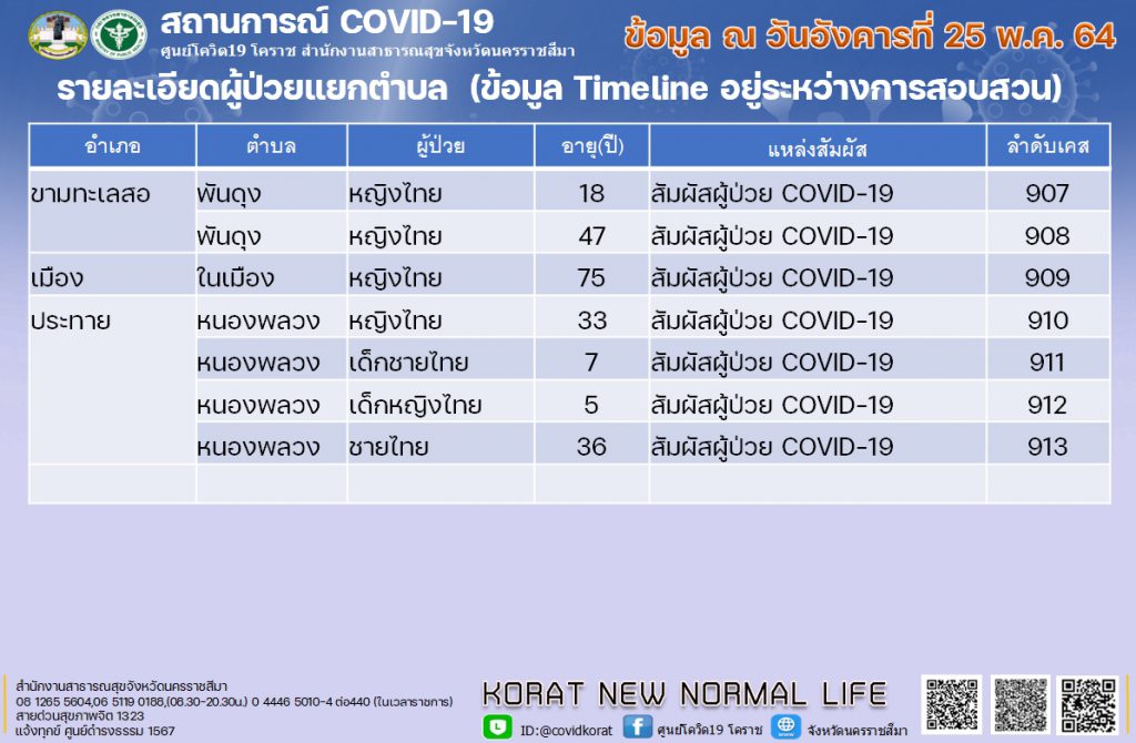 สำหรับสถานการณ์การแพร่ระบาดของไวรัสโควิด-19ในพื้นที่จังหวัดนครราชสีมา ล่าสุดวันนี้พบผู้ติดเชื้อรายใหม่ 7 ราย แยกเป็นในพื้นที่อำเภอเมืองนครราชสีมา 1 ราย , อ.ประทาย 4 ราย , อ.ขามทะเลสอ 2ราย พบผู้ป่วยใน 30 อำเภอ ส่วนใหญ่ติดเชื้อมาจากการสัมผัสผู้ป่วยรายก่อนหน้า รวมยอดผู้ป่วยระลอกใหม่สะสม 913 ราย รักษาหาย 708 ราย ยังรักษาอยู่ 195 ราย และล่าสุดมีผู้เสียชีวิตเพิ่ม 1 รายรวมผู้เสียชีวิตสะสมเป็น 10 ราย