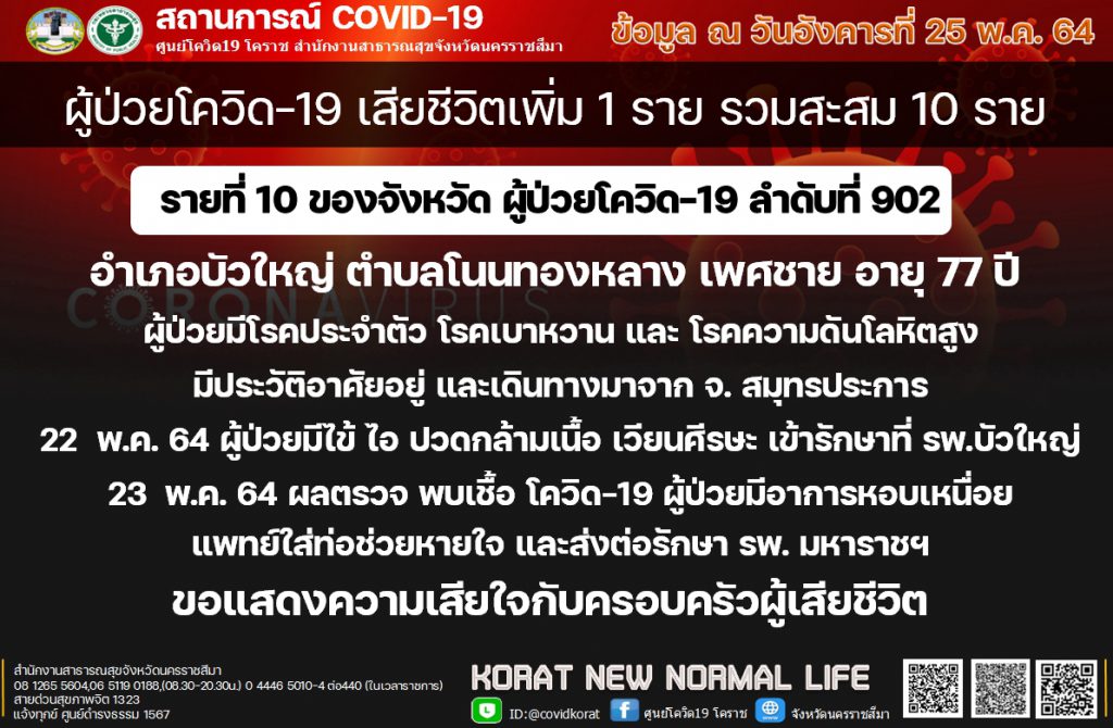 ทั้งนี้ผู้เสียชีวิตรายที่ 10 ผู้ป่วยโควิด-19 ลำดับที่ 902 อำเภอบีวใหญ่ ตำบลโนนทองหลาง เพศชาย อายุ 77 ปี ผู้ป่วยมีโรคประจำตัว โรคเบาหวาน และความดันโลหิตสูง มีประวัติอาศัยอยู่ และเดินทางมาจาก จ.สมุทรปราการ 22 พ.ค. 2564 ผู้ป่วยมีไข้ ไอ ปวดกล้ามเนื้อ วิงเวียนศีรษะ เข้ารักษาตัวที่ รพ.บัวใหญ่ ต่อมา 23 พ.ค. 2564 ผลตรวจพบเชื้อโควิด-19 ผู้ป่วยมีอาการหอบเหนื่อย แพทย์ใส่ท่อช่วยหายใจ และส่งต่อรักษา รพ.มหาราชนครราชสีมา