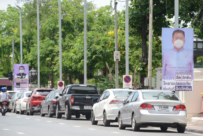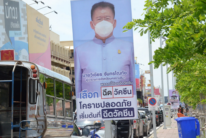 ขณะที่บรรยากาศการรณรงค์ฉีดวัคซีนของ จ.นครราชสีมา โดบรอบอนุสาวรีย์ท้าวสุรนารีตามเสาไฟฟ้าส่องสว่างมีรูปภาพป้ายลักษณะคล้ายป้ายหาเสียงเลือกตั้ง โดยแต่ละป้ายตั้งติดตั้งห่างกันช่วง 4-5 ต้นต่อ 1 ป้าย โดยมีรูปภาพของนายวิเชียร จันทรโณทัย ผู้ว่าราชการจังหวัดนครราชสีมา พร้อมชื่อ นามสกุล ตำแหน่ง และชื่อพรรคนี้ต้องฉีดโควิด โคราชปลอดภัย เริ่มต้นที่ฉีดวัคซีน ส่วนป้ายที่มีชื่อและรูปภาพนายแพทย์สาธารณสุขจังหวัดนครราชสีมา โดยด้านบนป้ายเขียนชื่อ พรรครอดวิด นายแพทย์นรินทร์รัชต์ พิชญคามินทร์ นายแพทย์สาธารณสุขจังหวัดนครราชสีมา ท่าทางยืนกอดอก #SAVEKORAT โดยเขียนว่า เลือก ในช่องกากบาท เขียนว่า ฉีด(ตัวสีน้ำเงิน) ส่วนวัคซีน(ตัวหนังสือสีแดง) และอีกป้ายเขียนว่า พรรคก่อนโควิด มีรูปภาพนายแพทย์เกรียงศักดิ์ วัชรนุกูลเกรียติ ผู้อำนวยการโรงพยาบาลมหาราชนครราชสีมา สวมเสื้อเชิ้ตสีขาวแขนยาว ท่าทางยืนกอดอก เลือกฉีดวัคซีน ฉีด..ดีกว่า...ไม่ฉีด #SAVEKORAT ลงทะเบียนวัคซีน..ฟรี จนเป็นที่สนอกสนใจของพี่น้องประชาชนที่สัญจรผ่านไปมาในตัวเมืองนครราชสีมา ซึ่งเป็นการรณรงค์ประชาสัมพันธ์ของสำนักงานสาธารณสุขจังหวัดนครราชสีมา ทำให้ได้ผลจนมีพี่น้องประชาชนร่วมลงทะเบียนคึกคักมากถึง 70%