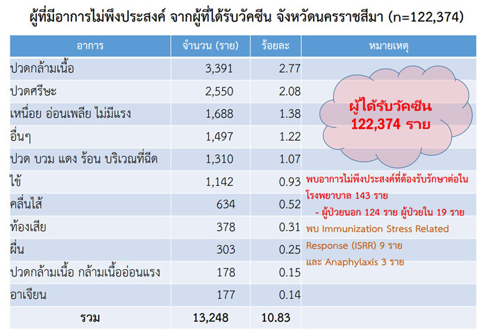 ขณะนี้ประชาชนบุคลากรทางการแพทย์ได้รับการฉีดวัคซีนป้องกันโควิดแล้วตั้งแต่วันที่ 4 เม.ย. -1 มิ.ย.2564 จำนวน 122,374 ราย พบอาการไม่พึงประสงค์ 13,248 ราย คิดเป็นร้อยละ 10.83 เช่น ปวดศรีษะ เหนื่อย อ่อนเพลีย ไม่มีแรง ปวด บวม แดง ร้อนบริเวณที่ฉีด ไข้ คลื่นไส้ ท้องเสีย ผื่น ปวดกล้ามเนื้อ กล้ามเนื้ออ่อนแรง อาเจียน พบอาการไม่พึงประสงค์ที่ต้องรับการรักษาต่อใน รพ. 143 ราย ผู้ป่วยนอก 124 ราย ผู้ป่วยใน 19 ราย รับการรักษาใน รพ.จำนวน 9 ราย และ มีอาการหนักจำนวน 3 ราย สรุปโดยรวมจะพบอาการเพียงเล็กน้อยเท่านั้น ส่วนผู้ที่เข้ารับการรักษาใน รพ.นั้น หลังจากนอนพักรักษาได้ประมาณ 3-4 วัน ก็สามารถกลับบ้านได้