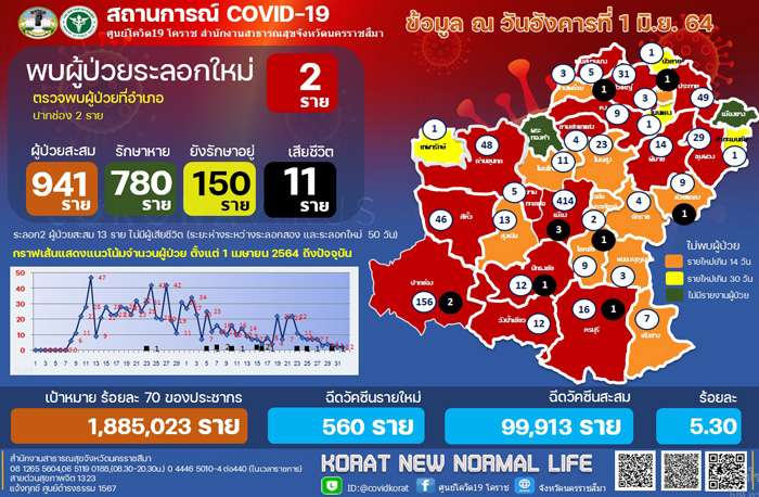 วันนี้ ( 1 มิ.ย.) ผู้สื่อข่าวรายงานสถานการณ์การแพร่ระบาดของโรคโควิด-19 ในพื้นที่ 32 อำเภอ ของจังหวัดนครราชสีมา พบผู้ป่วยรายใหม่เพิ่ม 2 ราย เป็นชาว อ.ปากช่องทั้ง 2 ราย โดยผู้ป่วยทำงานในพื้นที่เสี่ยง (CPF แก่งคอย จ.สระบุรี) รวมผู้ป่วยสะสม 941 ราย รวมหายป่วยสะสม 780 ราย รวมเสียชีวิตสะสม11 ราย คงเหลือรักษาตัว 150 ราย
