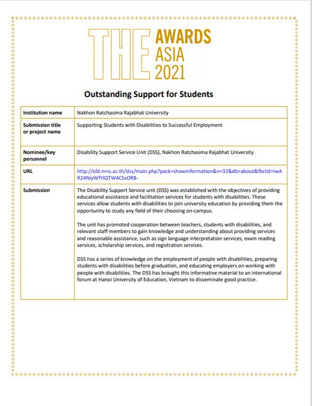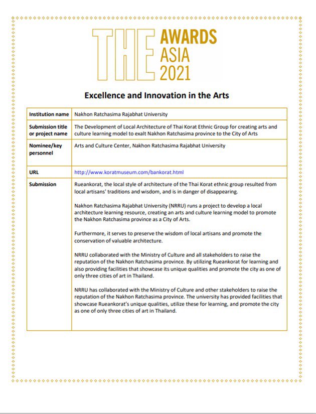 สำนักศิลปะและวัฒนธรรม มหาวิทยาลัยราชภัฏนครราชสีมา ผ่านรอบคัดเลือกTHE AWARDS ASIA 2021“Excellence and Innovation in the Arts” ความเป็นเลิศ ด้านนวัตกรรมทางศิลปะ ด้านการพัฒนาสถาปัตยกรรมท้องถิ่นของกลุ่มชาติพันธุ์ไทโคราชเพื่อสร้างรูปแบบการเรียนรู้ศิลปวัฒนธรรมเพื่อเชิดชูจังหวัดนครราชสีมาสู่เมืองแห่งศิลปะ พร้อมกันนี้ ศูนย์การศึกษาพิเศษ มหาวิทยาลัยราชภัฏนครราชสีมาได้ผ่านรอบคัดเลือก THE AWARDS ASIA 2021“Outstanding Support for Students”ด้านการสนับสนุนที่โดดเด่นสำหรับนักเรียน อีกหนึ่งหน่วยงานของมหาวิทยาลัยราชภัฏนครราชสีมา ด้วยเช่นกัน THE World Universities Insights Limited เป็นหน่วยงานจัดอันดับมหาวิทยาลัยระดับโลก เพื่อยกย่องความเป็นผู้นำและผลงานที่โดดเด่นของสถาบันการศึกษา ใน 8 หมวดหมู่ ซึ่ง THE Awards Asia 2021 นี้จะมีเพียง 8 มหาวิทยาลัยในเอเชียเท่านั้นที่จะได้ขึ้นบอร์ดนี้ โดยมหาวิทยาลัยราชภัฏนครราชสีมาได้ส่งผลงาน ทั้ง2 ด้าน ผลปรากฎว่าผ่านการคัดเลือกทั้ง 2 ด้าน