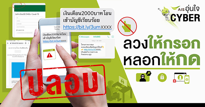 ท่ามกลางความสับสนของข้อมูลในช่วงสถานการณ์การแพร่ระบาดของ COVID-19 ที่สร้างผลกระทบกับผู้คนในทุกสาขาอาชีพ ทำให้กลุ่มมิจฉาชีพใช้เรื่องดังกล่าวมาเป็นเครื่องมือในการสร้างกลลวงกับประชาชน สร้างความเสียหายจากภัยไซเบอร์ในช่วงนี้มากมาย AIS โดย AIS อุ่นใจCyber คู่คิดดิจิทัล เพื่อคนไทยทุกเจเนอเรชัน ได้เฝ้าระวังและเห็นพฤติกรรมของมิจฉาชีพและกลโกงออนไลน์ จึงขอเป็นอีกหนึ่งเสียงเตือนคนไทยระวังภัยไซเบอร์ที่มาในรูปแบบของฟิชชิ่ง (Phishing) “ลวงให้กรอก หลอกให้กด” ซึ่งอาจทำให้สูญเสียข้อมูลส่วนตัว จนสร้างความเสียหายให้กับชีวิตและทรัพย์สินได้