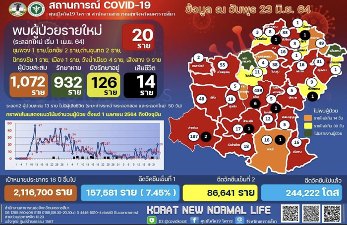 ส่วนสถานการณ์การระบาดของโควิด-19 ของจังหวัดนครราชสีมา พบผู้ป่วยรายใหม่ล่าสุดวันนี้ พบผู้ป่วย จำนวน 20 ราย  พบในพื้นที่อำเภอชุมพวง 1 ราย  อำเภอโชคชัย  2  ราย  อำเภอด่านขุนทด  2  ราย  ปักธงชัย  1 ราย  อำเภอเมือง 1 ราย  อำเภอวังน้ำเขียว  4  ราย  และอำเภอเสิงสาง  9 ราย    รวมผู้ป่วยสะสม 1,072 ราย  รักษาหาย 932 ราย  ยังคงรักษา 126 ราย  เสียชีวิตรวม 14 ราย