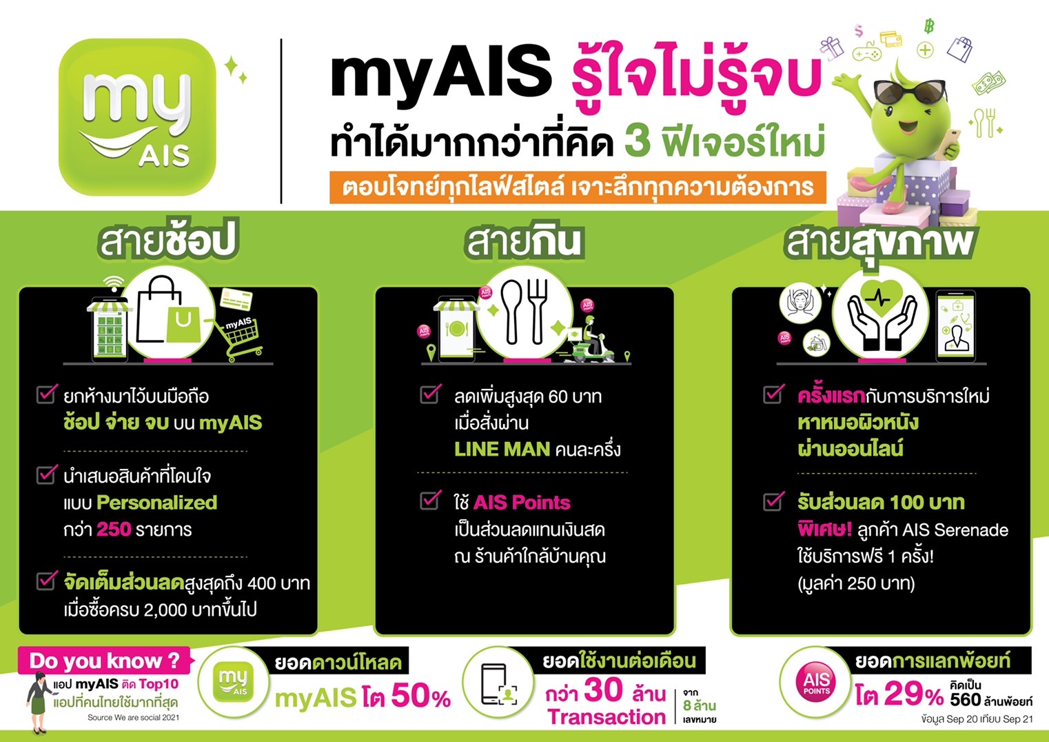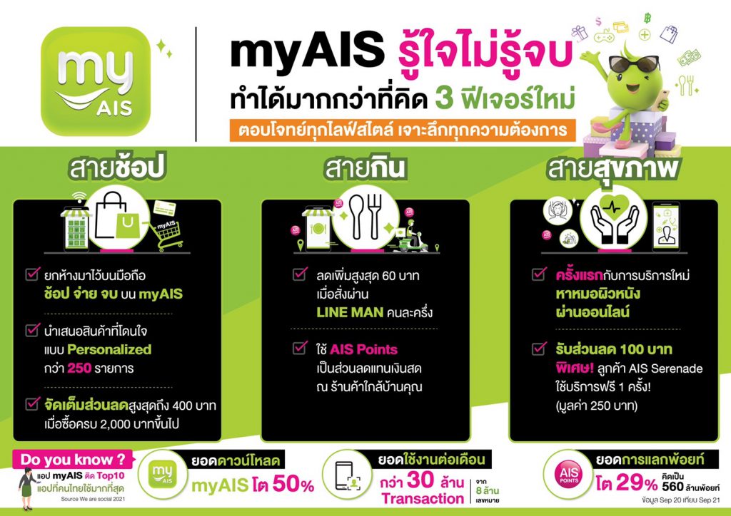 การดูแลลูกค้ากว่า 43.7 ล้านราย ทั้งด้านการใช้งาน และสิทธิพิเศษ ที่ตอบโจทย์ตรงใจอย่างแท้จริงถือเป็นเป้าหมายหลักของ AIS เสมอมา โดยหัวใจสำคัญสูงสุดคือ ยกระดับช่องทางส่งมอบบริการดังกล่าวอย่างสอดคล้องกับรูปแบบการใช้ชีวิตที่วันนี้อยู่บน Online เป็นหลัก ซึ่ง AIS ได้ดำเนินการมาอย่างต่อเนื่อง ทำให้วันนี้ myAIS ก้าวสู่การเป็นไลฟ์สไตล์แอปไทยจากผู้ให้บริการมือถือเพียง 1 เดียว ที่ We Are Social รายงานสถิติ Thailand Digital Stat 2021 ได้จัดอันดับให้อยู่ใน Top10 ของแอปที่คนไทยใช้มากที่สุด (รวมแอป social ยอดนิยมต่างประเทศ) โดยล่าสุดชูแนวคิด myAIS รู้ใจไม่รู้จบ ทำได้มากกว่าที่คิด เพิ่มฟีเจอร์ที่ตอบโจทย์ไลฟ์สไตล์หลัก สุขภาพ ช้อป กิน/ดื่ม ครบจบในแอปเดียว