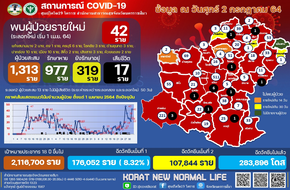 วันนี้ (2 กรกฎาคม 2564) ที่ห้องประชุมสำนักงานการท่องเที่ยวและกีฬาจังหวัดนครราชสีมา ศูนย์ปฏิบัติการภาวะฉุกเฉิน นายศักดิ์สิทธิ์สกุลลิขเรศสีมา รองผู้ว่าราชการจังหวัดมุกดาหาร รองประธานคณะกรรมการโรคติดต่อจังหวัดนครราชสีมา นายแพทย์วิชาญ คิดเห็น รองนายแพทย์สาธารณสุขจังหวัดฯ และนพ.เจษฎ์ บุณยวงศ์วิโรจน์ ผู้ช่วยผู้อำนวยการโรงพยาบาลมหาราชนครราชสีมาประชุมคณะกรรมการโรคติดต่อจังหวัดฯ สถานการณ์การระบาดของไวรัสโควิด-19 ในพื้นที่จังหวัดนครราชสีมา ล่าสุดพบผู้ติดเชื้อรายใหม่วันนี้พุ่งขึ้นเท่าตัว จากเมื่อวานนี้ 22 รายเป็นจำนวน 42 ราย กระจายอยู่ในหลายอำเภอ 31 อำเภอ จาก 32 อำเภอ ซึ่งเหลือเพียง อำเภอเมืองยาง 1 เดียวเท่านั้นที่ไข่ยังไม่แตก ส่วนผู้ป่วยรายใหม่ ส่วนใหญ่เดินทางมาจากจังหวัดพื้นที่เสี่ยงสูง 17 ราย โดยการการระบาดพบในพื้นที่ อ.แก้งสนามนาง 2 ราย , อ.คง 1 ราย , อ.ครบุรี 6 ราย , อ.โชคชัย 3 ราย , อ.ด่านขุนทด 3 ราย , อ.ปากช่อง 10 ราย , อ.เมือง 10 ราย , อ.สีคิ้ว 2 ราย , อ.เสิงสาง 3 ราย และ อ.ห้วยแถลง 2 ราย รวมผู้ติดเชื้อระลอกใหม่สะสม 1,313 ราย รักษาหายแล้ว 977 ราย ยังรักษาตัวอยู่ 319 ราย และเสียชีวิต 17 ราย สรุปความเสี่ยง/ประวัติสัมผัสเดินทางมาจากพื้นที่เสี่ยง กรุงเทพมหานคร 8 ราย , จากพื้นที่เสี่ยง จ.ฉะเชิงเทรา 1 ราย , จ.ปทุมธานี 4 ราย , จ.สมุทรปราการ 8 ราย สัมผัสผู้ป่วยโควิด-19 อยู่ระหว่างการสอบสวน 4 ราย ส่วนการฉีดวัคซีนเข็มที่ 1 จนถึงขณะนี้จำนวน 176,052 ราย(8.32%) เข็มที่ 2 จำนวน 107,844 ราย รวมทั้ง 2 เข็มจำนวน 283,896 โดส