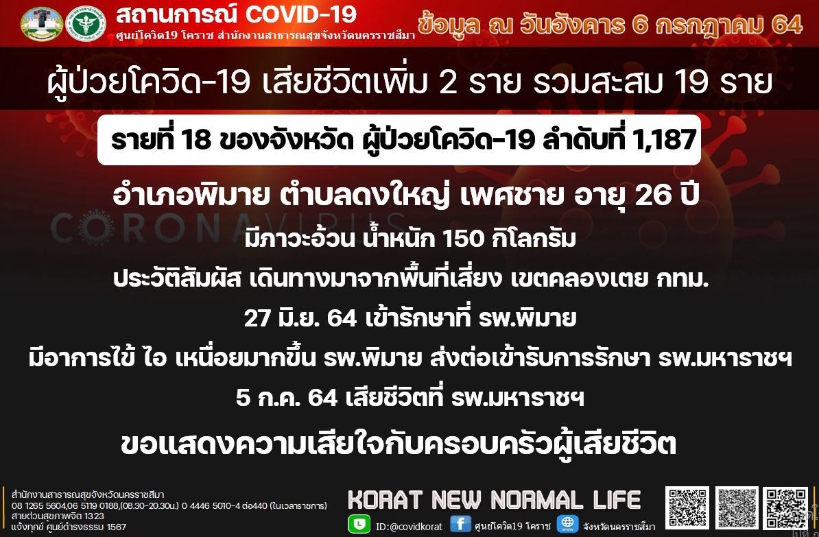 สำหรับไทม์ไลน์ผู้เสียชีวิตทั้ง 2 รายนั้นพบว่า รายที่ 18 ลำดับที่ 1,187 อำเภอพิมาย ตำบลดงใหญ่ เพศชาย อายุ 26 ปี มีภาวะอ้วน น้ำหนัก 150 กิโลกรัม ประวัติสัมผัสผู้เดินทางมาจากพื้นที่เสี่ยง เขตคลองเตย กทม. วันที่ 20 มิ.ย. 2564 รักษาที่ รพ.พิมาย มีอาการไข้ ไอ เหนื่อยมากขึ้น รพ.พิมาย ส่งตัวเข้ารับการรักษา รพ.มหาราชนครราชสีมา วันที่ 5 ก.ค. 2564 เสียชีวิตที่ รพ.มหาราชนครราชสีมา