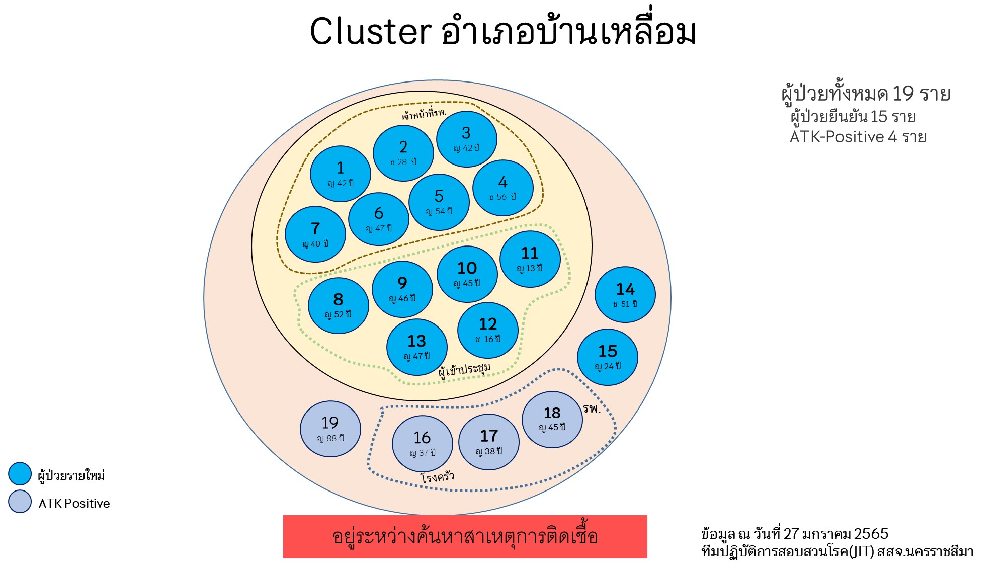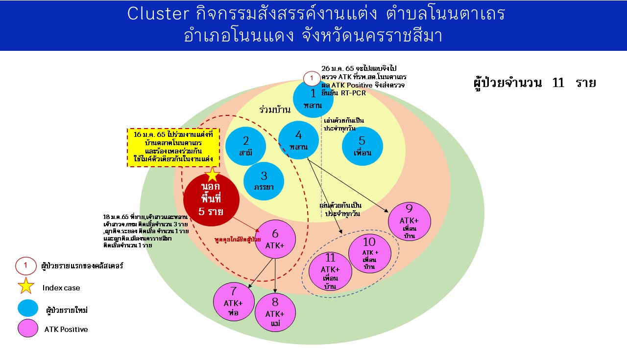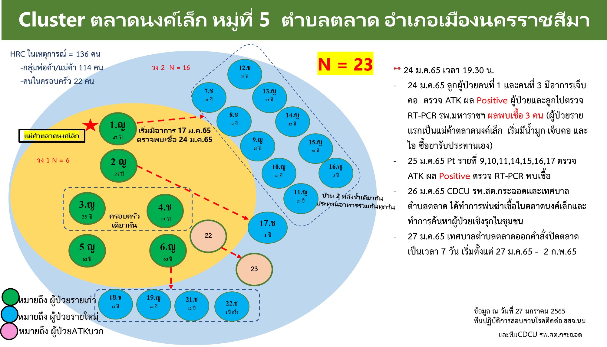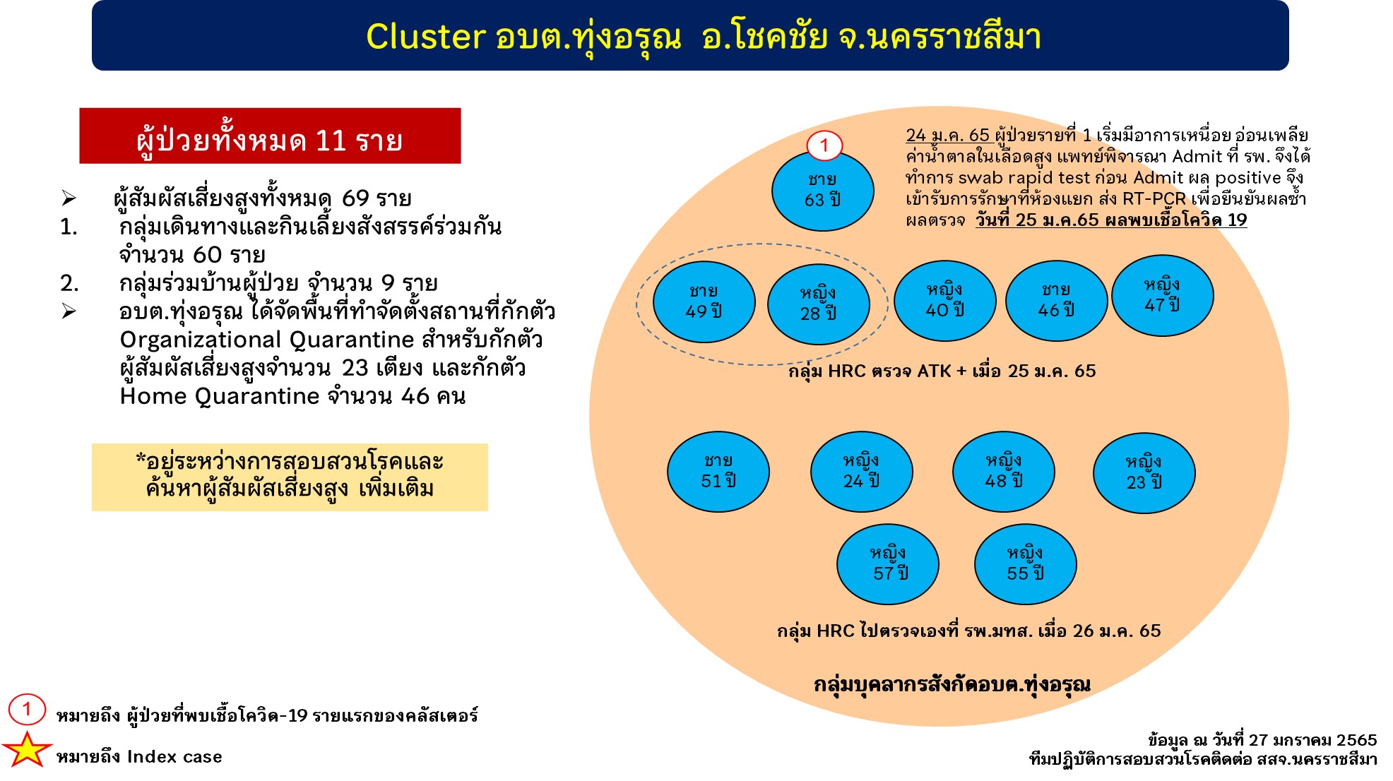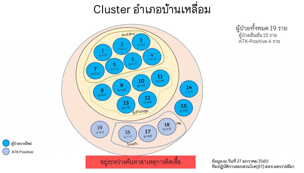 ขณะที่คณะกรรมการโรคติดต่อจังหวัดฯ และทีมสอบสวนโรคสำนักงานสาธารณสุขจังหวัดนครรราชสีมา ให้ความสำคัญมีความห่วงใยและกังวลการเกิดคลัสเตอร์ โดยเฉพาะคลัสเตอร์ใหม่ที่เกิดการระบาด 10 คลัสเตอร์ มีการส่งทีมสอบสวนโรคจังหวัด และทีมสอบสวนโรคของสาธารณสุขจังหวัด ร่วมกับทีมสอบสวนโรคในพื้นที่ของแต่ละอำเภอ ประสานกับ รพ.สต. - อบต. ตรวจเชิงรุก โดยมีการตรวจ ATK แบบปูพรหมทุกพื้นที่อย่างเข้มข้นพร้อมกับดำเนินการควบคุมสถานการณ์การระบาดให้ได้ และได้รับความร่วมมือเป็นอย่างดี ทั้งนี้มีการค้นหาเชิงรุกผู้สัมผัสเสี่ยงสูงให้ครอบคลุมและดำเนินการกักตัว ตรวจเข้มอย่างละเอียดต่อไป โดยคลัสเตอร์ส่วนหนึ่งสามารถดำเนินการยับยั้งควบคุมได้เป็นอย่างดี