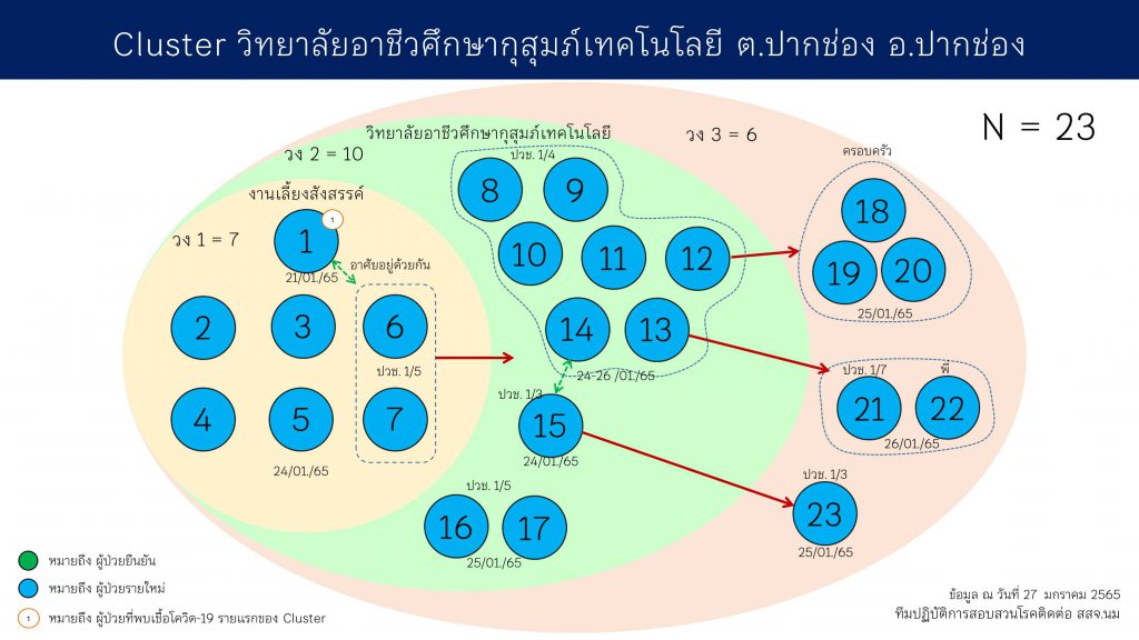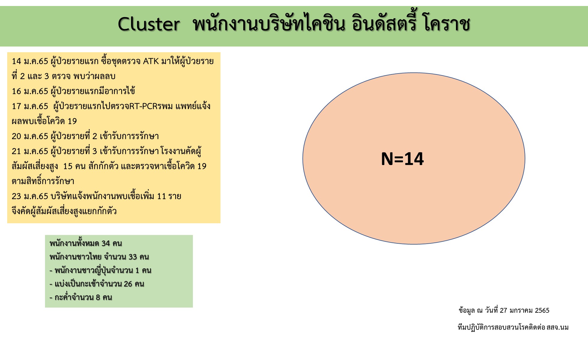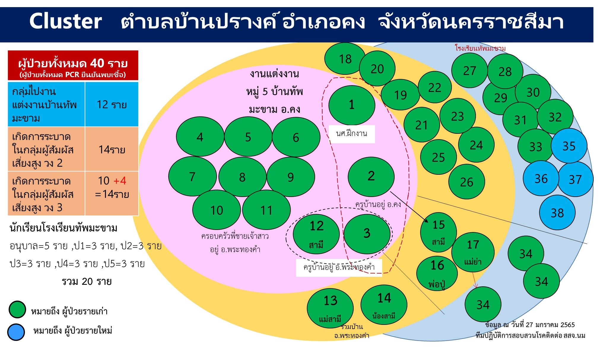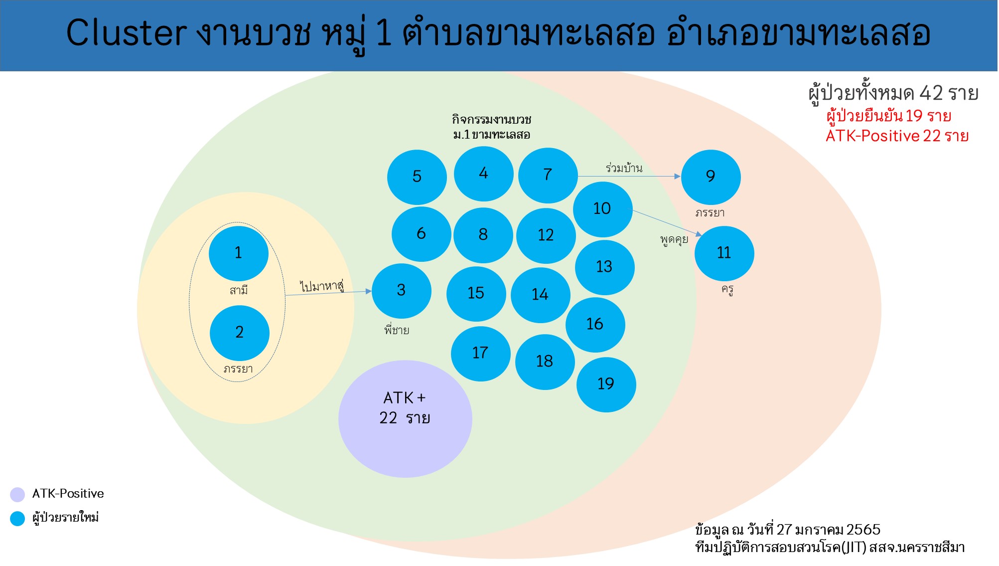ขณะที่คณะกรรมการโรคติดต่อจังหวัดฯ และทีมสอบสวนโรคสำนักงานสาธารณสุขจังหวัดนครรราชสีมา ให้ความสำคัญมีความห่วงใยและกังวลการเกิดคลัสเตอร์ โดยเฉพาะคลัสเตอร์ใหม่ที่เกิดการระบาด 10 คลัสเตอร์ มีการส่งทีมสอบสวนโรคจังหวัด และทีมสอบสวนโรคของสาธารณสุขจังหวัด ร่วมกับทีมสอบสวนโรคในพื้นที่ของแต่ละอำเภอ ประสานกับ รพ.สต. - อบต. ตรวจเชิงรุก โดยมีการตรวจ ATK แบบปูพรหมทุกพื้นที่อย่างเข้มข้นพร้อมกับดำเนินการควบคุมสถานการณ์การระบาดให้ได้ และได้รับความร่วมมือเป็นอย่างดี ทั้งนี้มีการค้นหาเชิงรุกผู้สัมผัสเสี่ยงสูงให้ครอบคลุมและดำเนินการกักตัว ตรวจเข้มอย่างละเอียดต่อไป โดยคลัสเตอร์ส่วนหนึ่งสามารถดำเนินการยับยั้งควบคุมได้เป็นอย่างดี