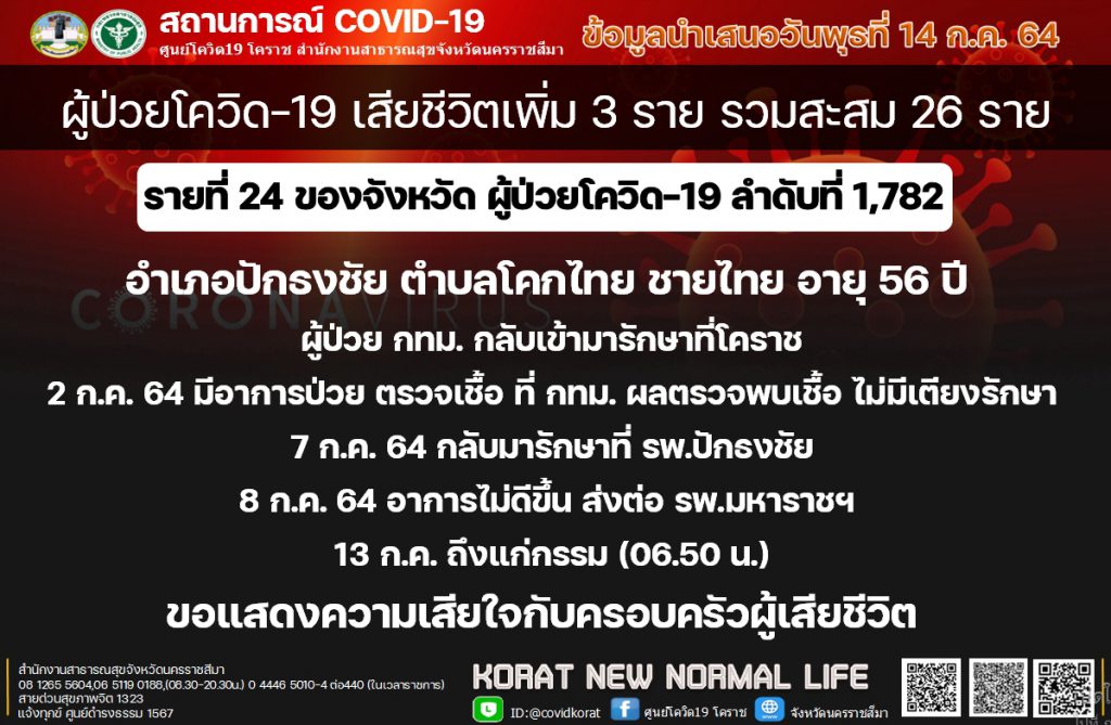 สถานการณ์การระบาดของไววัสโคโรน่า หรือโควิด-19 ที่จังหวัดนครราชสีมา ขยายวงต่อเนื่อง ล่าสุดวันนี้ (15 ก.ค.) พบผู้ป่วยรายใหม่ 97 ราย เสียชีวิตเพิ่มวันเดียว 3 ราย รวมผู้เสียชีวิตสะสม 26 ราย ขณะที่การระบาดของเชื้อยังรุนแรงและขยายวงกว้างออกไปต่อเนื่อง