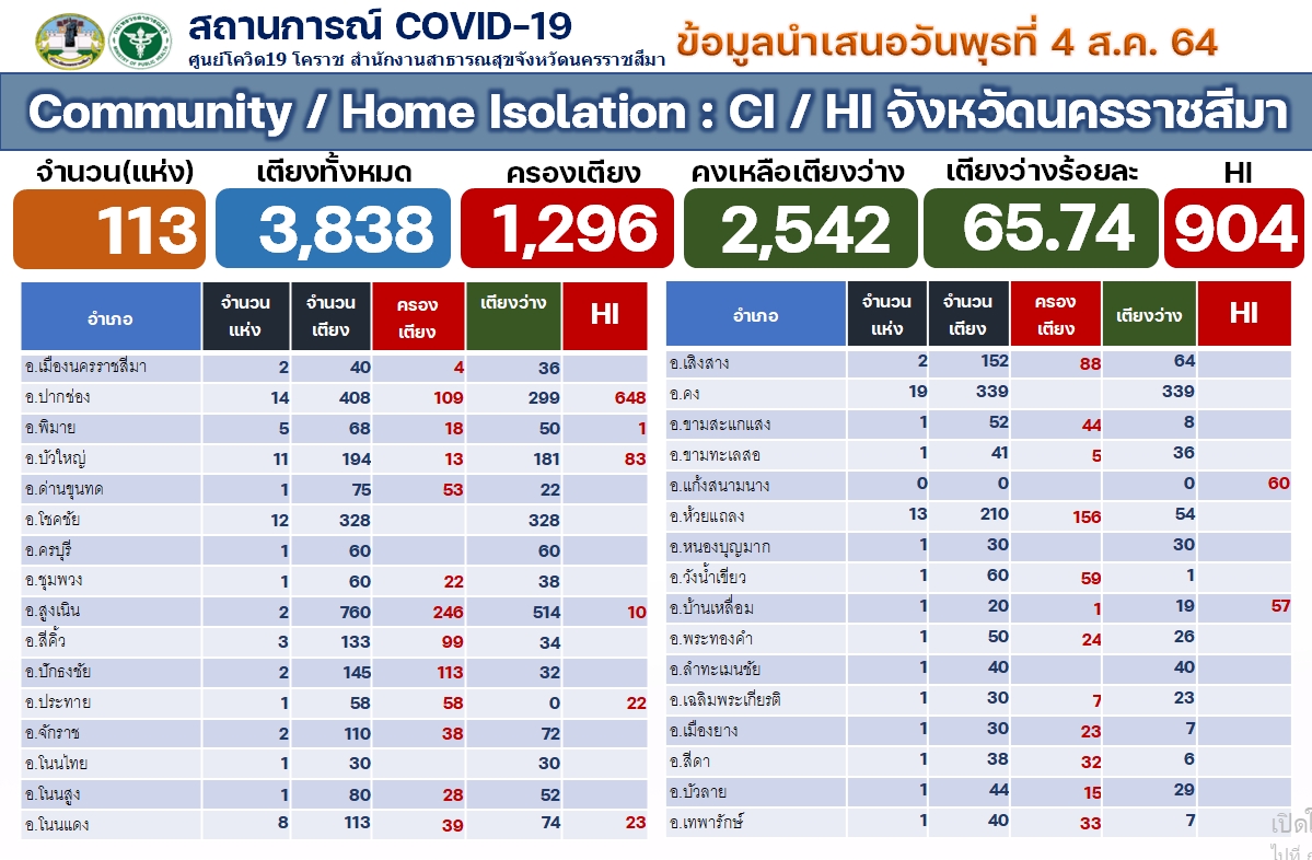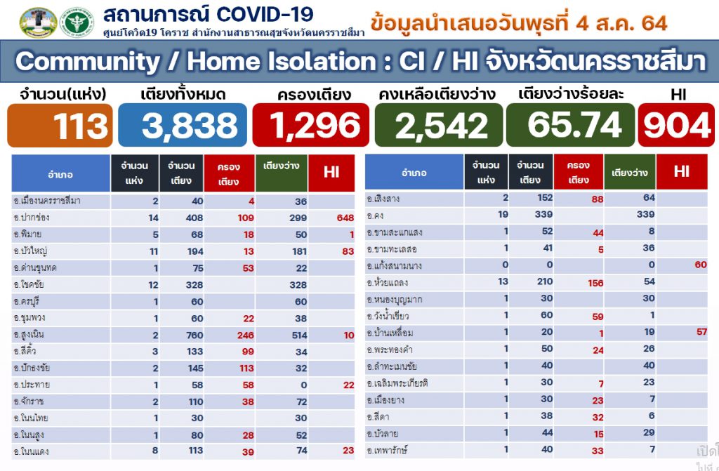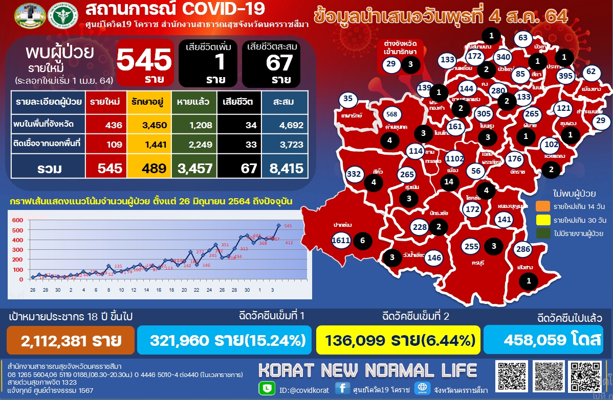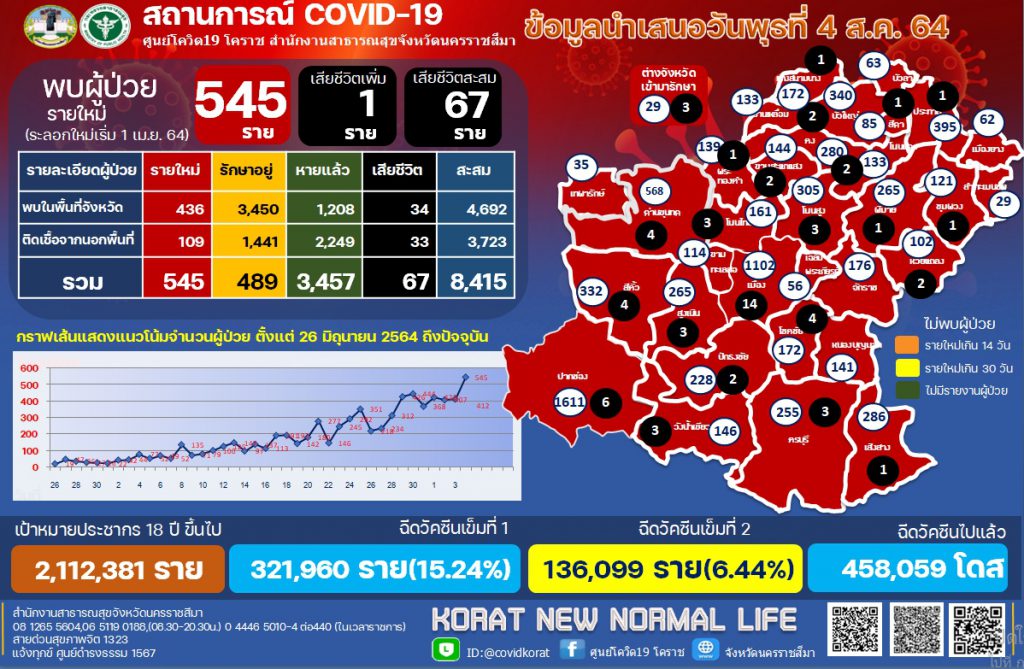 โคราชป่วยโควิดพุ่งพรวด 545 รายเสียชีวิต 1 รายสะสม 67 ราย  ผู้ว่าฯ ห่วงคลัสเตอร์ สั่งทีมสอบสวนโรคเคลียร์ วันนี้ (4 สิงหาคม 2564) ที่ศูนย์บัญชาการเหตุการณ์ตอบโต้โรคติดต่อเชื้อไวรัสโคโลนา 2019 ห้องประชุมสำนักงานท่องเที่ยวและกีฬาจังหวัดนครราชสีมา นายกอบชัย บุญอรณะ ผู้ว่าราชการจังหวัดนครราชสีมา ประธานคณะกรรมการโรคติดต่อ จ.นครราชสีมา พร้อมด้วยนายศักดิ์สิทธิ์ สกุลริขเรศสีมา รอง ผวจ.นครราชสีมา ประชุมคณกรรมการโรคติดต่อจังหวัดนครราชสีมา  โดยสถานการณ์ล่าสุดของจังหวัดนครราชสีมา ล่าสุดพบผู้ป่วยติดเชื้อรายใหม่นิวไฮ 545ราย ผู้ป่วยเสียชีวิตรายวันอีก 1 ราย รวมเสียชีวิตสะสม 67 ราย โดยในจำนวนเดินทางมาจากพื้นที่เสี่ยง 436 คน สัมผัสผู้ป่วยติดเชื้อ 109 คน รับผู้ป่วยขอกลับมารักษา 94 คน รวมผู้ป่วยระลอกใหม่สะสมของจังหวัดนครราชสีมา 8,415 ราย รักษาอยู่ 4,891 ราย ข่าวดีรักษาหาย 3,457 ราย โดยวันนี้( 4 ส.ค. 64 ) สถานการณ์ covid-19 จังหวัดนครราชสีมา รายงานผู้ป่วยรายใหม่ที่พบติดเชื้อมากที่สุด อ.คง 100 ราย , อ.พระทองคำ 70 ราย , อ.ปากช่อง 61 ราย , อ.ด่านขุนทด 54 ราย , อ.ปักธงชัย 41 ราย , อ.ห้วยแถลง 33 ราย , อ.โชคชัย 28 ราย , อ.ประทาย 28 ราย , อ.ขามสะแกแสง 20 ราย , อ.โนนแดง 20 ราย เป็นต้น  สรุปความเสี่ยง/ประวัติสัมผัสเดินทางมาจากพื้นที่เสี่ยง 321 ราย สัมผัสผู้ป่วย 109 ราย  ส่วนสถานการณ์เตียงตามโรงพยาบาลต่างๆ ทุกแห่งใน จ.นครราชสีมา เตียงโรงพยาบาลเต็มหมดและล้นหมด รวมทั้งเตียงชุมชนอำเภอต่างๆก็เต็มหมดเช่นเดียวกัน แต่ที่เตียงยังพอมีคือ อ.โนนสูง , อ.จักราช , อ.พิมาย ซึ่งเป็นการขยายเตียง รพ.สนามที่สามารถรองรับได้