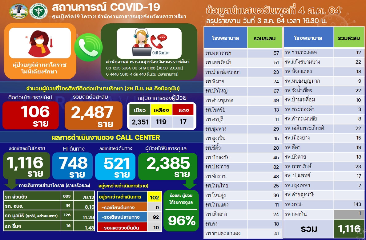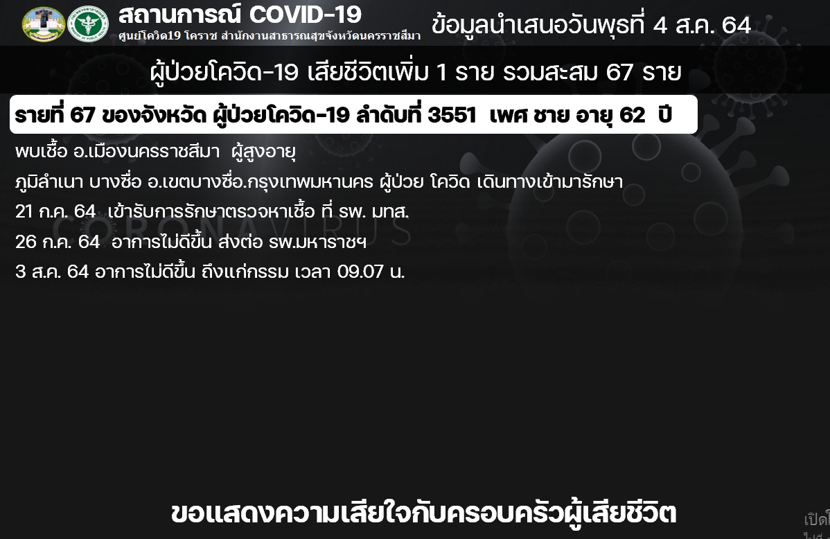 สำหรับผู้ป่วยเสียชีวิตรายวันรายใหม่เพิ่มอีก 1 รายเป็นชาว อ.เมืองนครราชสีมา  รายที่ 67 เพศชาย อายุ 62 ปี ผู้สูงอายุ ภูมิลำเนาเขตบางซื่อ กทม. ผู้ป่วยโควิด เดินทางเข้ามารักษา วันที่ 21 ก.ค. 62 เข้ารักษาตรวจหาเชื้อ ที่ รพ.มทส. วันที่ 26 ก.ค. 64 อาการไม่ดีขึ้น ส่งต่อ รพ.มหาราชฯ วันที่ 3 ส.ค. 64 อาการไม่ดีขึ้น ถึงแก่กรรม