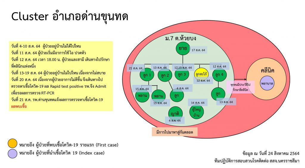 3.คลัสเตอร์ครอบครัว หมู่ 7 ต.ห้วยบง อ.ด่านขุนทด จ.นครราชสีมา พบผู้ป่วยรายแรกเป็นหญิงสูงวัย โดยวันที่ 11 ส.ค. 64 เริ่มมีอาการไข้ ไอ ปวดหัว ช่วงเย็นวันที่ 12 ส.ค. 64 ผู้ป่วยและสามี เดินทางรักษาที่คลินิกแห่งหนึ่งในตัว อ.ด่านขุนทด แต่อาการไม่ดีขึ้น วันที่ 20 ส.ค.64 จึงไปรักษาและตรวจหาเชื้อที่ รพ.ด่านขุนทด วันที่ 21 ส.ค. 64ผลยืนยันติดเชื้อ ต่อมาคนในครอบครัวมีอาการป่วยและเดินทางไปรักษาที่คลินิกเดียวกันและพบผู้ป่วยเพิ่มขึ้นรวมทั้งพยาบาลประจำคลินิกด้วย รวมผู้ป่วยติดเชื้อโควิด จำนวน 13 ราย