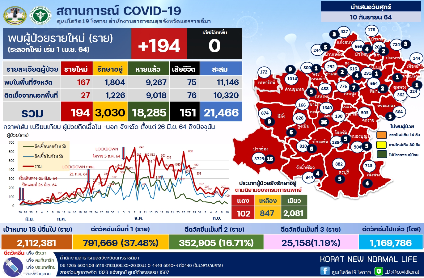 วันนี้( 10 ก.ย. 2564) ที่ห้องประชุมสำนักงานการท่องเที่ยวและกีฬาจังหวัดนครราชสีมา นายศักดิ์สิทธิ์ สกุลลิขเรศสีมา รอง ผวจ.นครราชสีมา พร้อมด้วยนายแพทย์วิญญู จันทร์เนตร รองนายแพทย์สาธารณสุขจังหวัดนครราชสีมา , นพ.เจษฏ์ บุญยวงศ์วิโรจน์ ผู้ช่วย ผอ.รพ.มหาราชฯ ร่วมการประชุมคณะกรรมโรคติดต่อ จ.นครราชสีมา ผ่านระบบ zoom ไปยังอำเภอทั้ง 32 อำเภอ พร้อมแถลงถึงสถานการณ์การแพร่ระบาดของเชื้อไวรัสโควิด-19ในพื้นที่จังหวัดนครราชสีมา ล่าสุดพบผู้ติดเชื้อรายใหม่ลดลงอย่างต่อเนื่อง 194 ราย วันนี้ไม่มีผู้ป่วยโควิดเสียชีวิต ผู้เสียชีวิตสะสม 151 ศพ ส่วนพื้นที่จังหวัดนครราชสีมามีผู้ป่วยสะสม 21,466 ราย ยังรักษาอยู่ 3,030 ราย รักษาหายแล้ว 18,285 ราย ติดเชื้อนอกพื้นที่จังหวัด 167 ราย ส่วนการติดเชื้อในจังหวัด 27 ราย ผู้ป่วยโควิด-19 รายใหม่ พบในพื้นที่อำเภอต่างๆลดลงอย่างต่อเนื่อง อ.เมือง 51 ราย , อ.ปากช่อง 33 ราย , อ.พิมาย 28 ราย , อ.สูงเนิน 13 ราย , อ.ครบุรี 8 ราย , อ.โชคชัย 8 ราย , อ.เสิงสาง 7 ราย , อ.ชุมพวง 6 ราย , อ.ด่านขุนทด 5 ราย , อ.บัวลาย 5 ราย , อ.ปักธงชัย 5 ราย เป็นต้น