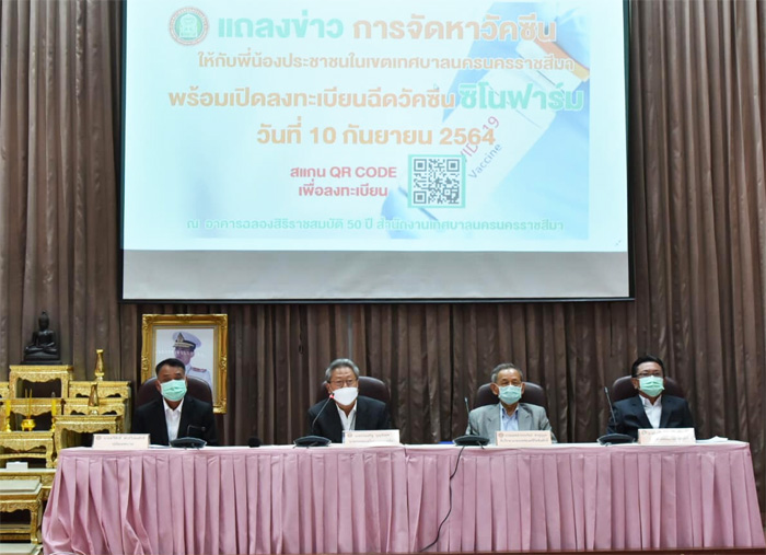 ขณะที่ที่ห้องประชุม ชั้น 5 ห้องประชุมสภาเทศบาลนครนครราชสีมา อาคารกาญจนาภิเษก สำนักงานเทศบาลนครนครราชสีมา นายประเสริฐ บุญชัยสุข นายกเทศมนตรีนครนครราชสีมา พร้อมด้วยนายแพทย์วรรณรัตน์ ชาญนุกูล ประธานที่ปรึกษานายกเทศมนตรี , นายไกรสีห์ หล่อธราประเสริฐ รองนายกเทศมนตรีเทศบาลนครนครราชสีมา และนายทวีศักดิ์ พันธ์วิเศษศักดิ์ ปลัดเทศบาลนครฯ ร่วมกันแถลงข่าววาระพิเศษการจัดซื้อวัคซีนสำหรับประชาชน และเทศบาลนครนครราชสีมาเปิดลงทะเบียนฉีดวัคซีนซิโนฟาร์ม รอบที่ 1 จากสถานการณ์โควิด-19 เทศบาลนครนครราชสีมานำแผนการดำเนินงานจัดซื้อวัคซีนซิโนฟาร์ม จำนวน 22,000 โดส มูลค่ากว่า 15 ล้านบาทจากราชวิทยาลัยจุฬาภรณ์ เพื่อฉีดให้กับประชาชนในเขตเทศบาลนครนครราชสีมา ทั้ง 91 ชุมชน จำนวน 11,000 คน ฉีดคนละ 2 ครั้ง เข็ม 1 และเข็ม 2 ห่างกัน 3-4 สัปดาห์ โดยประชาชนไม่ต้องเสียค่าใช้จ่ายใดๆ ทั้งนี้ทั้งนั้นหากวัคซีนไม่เพียงพอก็พร้อมในการจัดหามาเพิ่มเติมให้เพียงพอ โดยสถานที่ฉีดที่ศูนย์การค้าเดอะมอลล์ นครราชสีมา โดยบุคลากรทางการแพทย์ รพ.เทพรัตน์นครราชสีมา