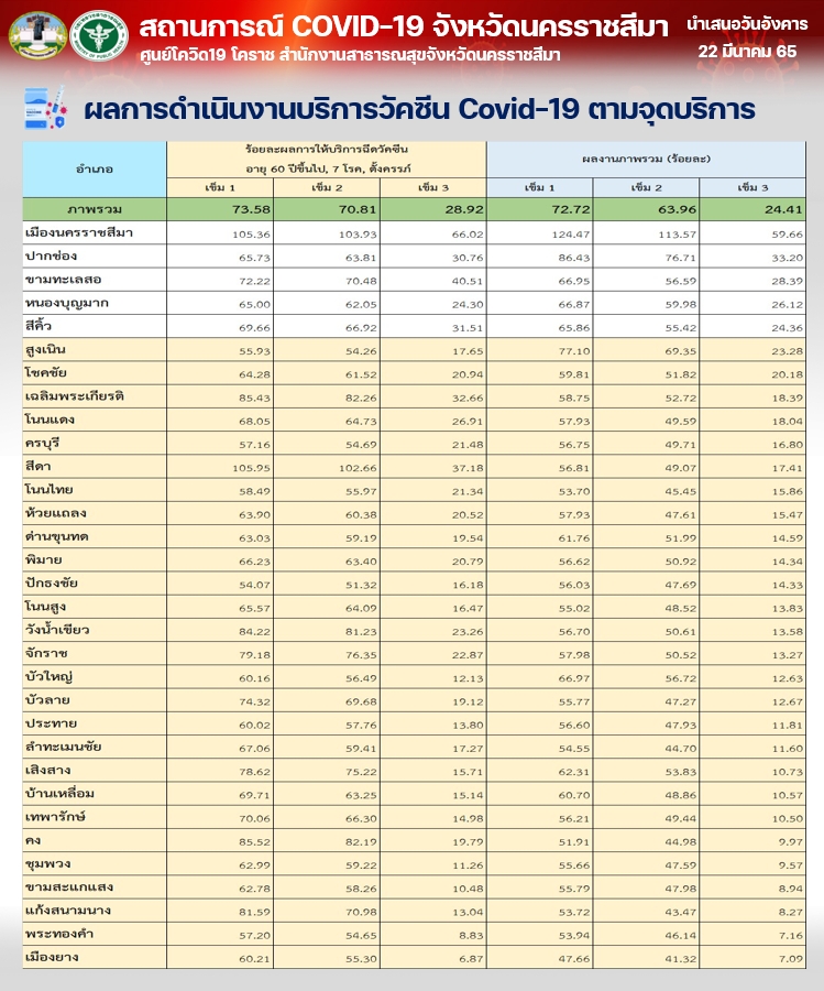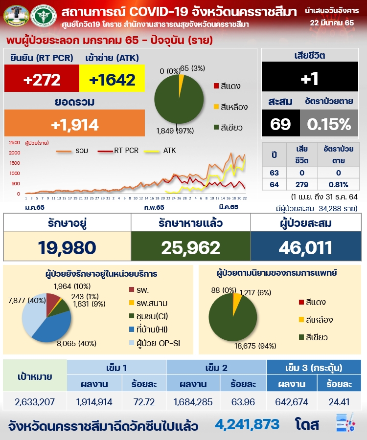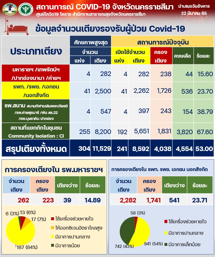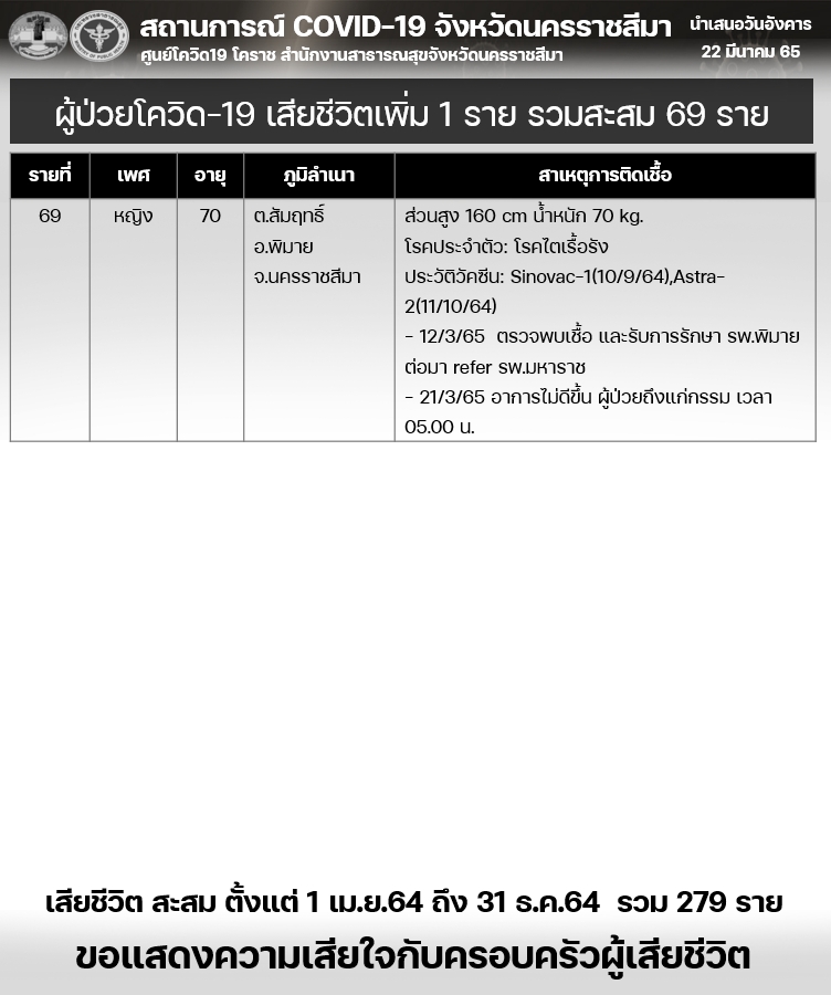 ในที่ประชุมมีการรายงานสถานการณ์การกระบาดของโควิด-19 ในพื้นที่ 32 อำเภอ ว่าพบผู้ป่วยรายใหม่ 1,914 ราย ป่วยสะสม 46,011 ราย รักษาอยู่ 19,980 ราย รักษาหาย 25,962 ราย เสียชีวิตรายใหม่ 1 ราย เป็นหญิงอายุ 70 ปี ต.สัมฤทธิ์ อ.พิมาย ประวัติรับวัคซีน 2 เข็ม มีโรคประจำตัวเป็นโรคไตวายเรื้อรัง เสียชีวิตสะสม 69 ราย สาเหตุสำคัญของการติดเชื้อส่วนใหญ่เกิดจากจากรวบตัวทำกิจกรรมทางสังคมร่วมกัน เช่น งานบุญ งานกุศล งานศพ งานแต่ง และการสัมผัสผู้ป่วยร่วมบ้านแพร่กระจายเข้าสู่ชุมชนทำให้ยอดผู้ป่วยรายใหม่เพิ่มสูงขึ้นเกือบ 2,000 ราย โดยมีคลัสเตอร์ที่ต้องเฝ้าระวังและป้องกันการแพร่เชื้ออย่างใกล้ชิดจำนวน 6 คลัสเตอร์ ประกอบด้วย 1.คลัสเตอร์สถานสงเคราะห์คนไร้ที่พึ่งบ้านเมตตา อ.เมือง พบผู้ป่วยรายแรกเป็นบุคลากรประกอบอาหาร จากนั้นได้ค้นหา พบป่วยสะสม 430 ราย 2.คลัสเตอร์กิจกรรมทัศนศึกษา จ.ประจวบคีรีขันธ์ ผู้ป่วยเป็นครูและนักเรียนโรงเรียนบ้านนางโทพัฒนา ต.เมืองยาง อ.เมืองยาง ป่วยสะสม 30 ราย 3.คลัสเตอร์ค่ายลูกเสือบ้านหนองแขม ต.ดอนใหญ่ อ.คง ป่วยสะสม 34 ราย 4.คลัสเตอร์งานบวชบ้านหนองหัวช้าง หมู่ 7 ต.เสมาใหญ่ อ.บัวใหญ่ ป่วยสะสม 35 ราย ผู้สัมผัสเสี่ยงสูง 250 ราย 5.คลัสเตอร์ชุมชนบ้านใหม่ศรีจันทร์ หมู่ 12 ต.ศรีละกอ อ.จักราช ป่วยสะสม 91 ราย และ 6.คลัสเตอร์โรงงานสีมาสเทคโนโลยี อ.ปักธงชัย ป่วยสะสม 38 ราย