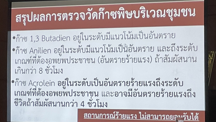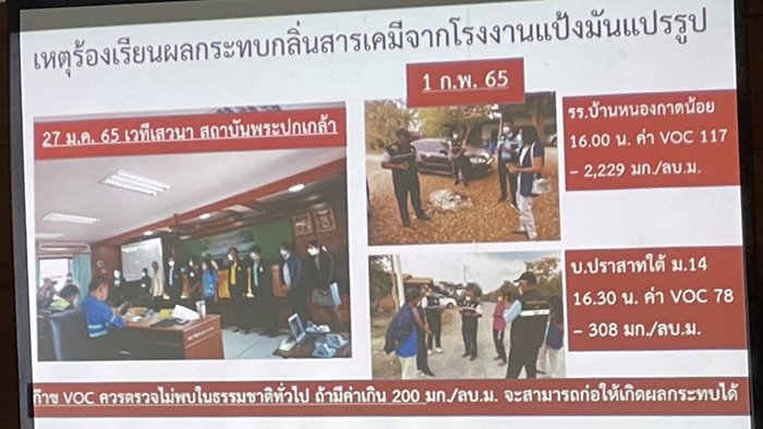 จากการตรวจสอบทั้งพื้นที่ภายในโรงงาน และโดยรอบชุมชนบ้านเพื่อเก็บข้อมูล พบว่า ในขั้นตอนการผลิตมีการใช้สารเคมีประเภทคลอรีน กรด และด่าง บริเวณบ่อพักน้ำเสียมีกลิ่นเหม็นฉุนรุนแรง ทางสำนักงานสิ่งแวดล้อมภาคที่ 11 นครราชสีมา จึงตรวจวัดก๊าซอินทรีย์ระเหยง่ายพบว่าเกินมาตรฐาน จึงมีคำสั่งให้โรงงานหยุดดำเนินการชั่วคราว และให้แก้ไขปัญหากลิ่นเหม็นจากบ่อพักน้ำเสีย และการรั่วไหลของก๊าซชนิดต่าง ๆ ให้แล้วเสร็จภายใน 45 วัน หลังจากนั้น เจ้าหน้าที่จากหน่วยงานที่เกี่ยวข้องจะเข้ามาตรวจสอบอีกครั้ง ซึ่งเมื่อครบกำหนดเมื่อวันที่ 21 มีนาคม 2565 ปรากฎว่ายังไม่ได้รับการแก้ไขจากโรงงาน