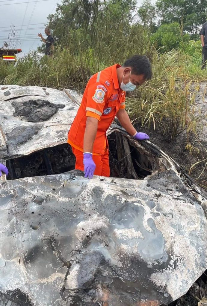 จากนั้นอาสาสมัครกู้ภัยฮุก 31 ได้นำรถยกมาช่วยร้อยสลิงดึงรถคันเกิดเหตุให้พลิกหงายขึ้นมา เพื่อตรวจพิสูจน์ซากที่หลงเหลือภายในรถ และหลังจากพลิกรถขึ้นมาแล้ว ตรวจสอบภายในรถถูกไฟไหม้เสียหายทั้งคัน และยังพบซากผู้เสียชีวิต 1 ราย อยู่ภายในรถ