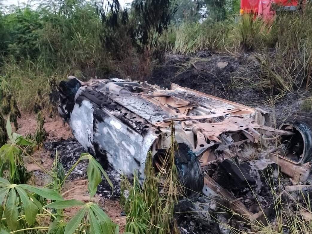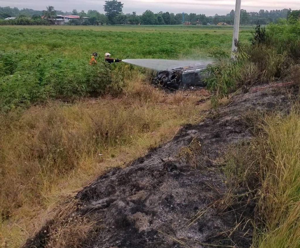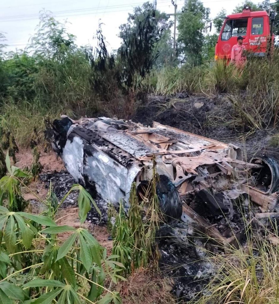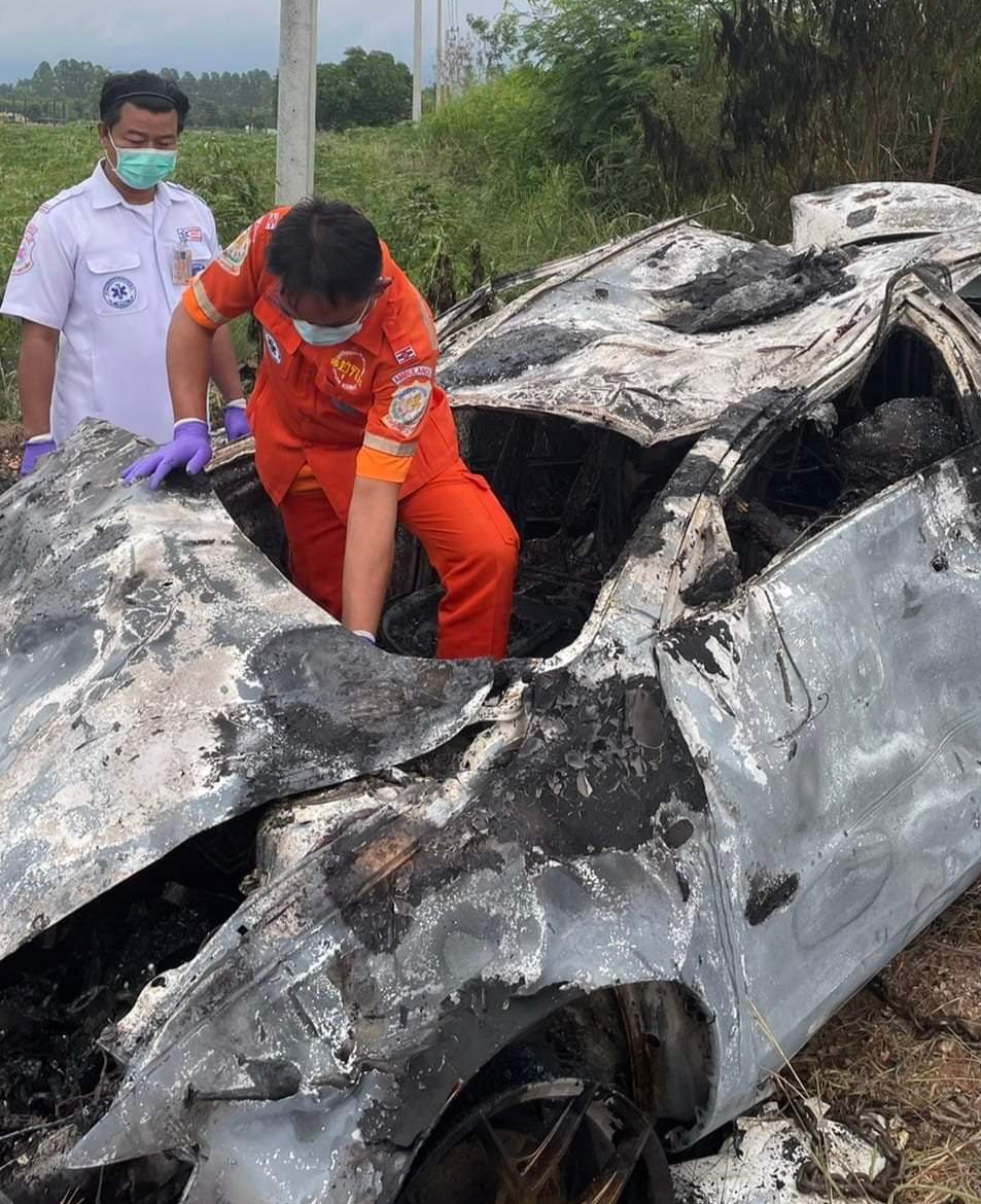 สลด! ไฟคลอกดับคารถหนุ่มโคราชซิ่งเก๋งกลับจากเที่ยวสถานบันเทิงหลับในรถเสียหลักพลิกคว่ำไฟลุกท่วม