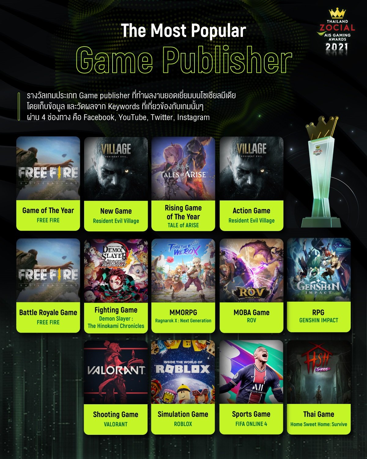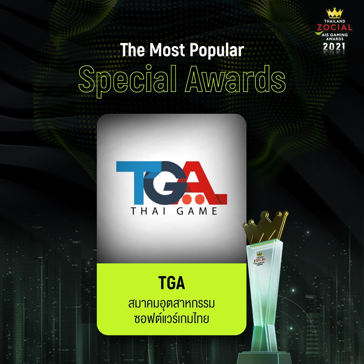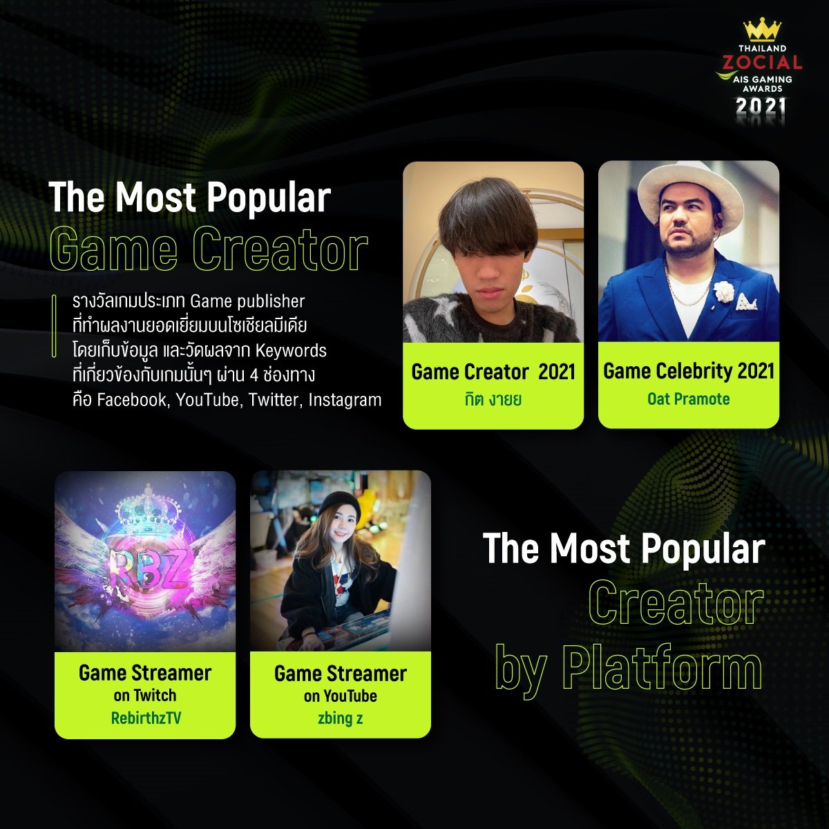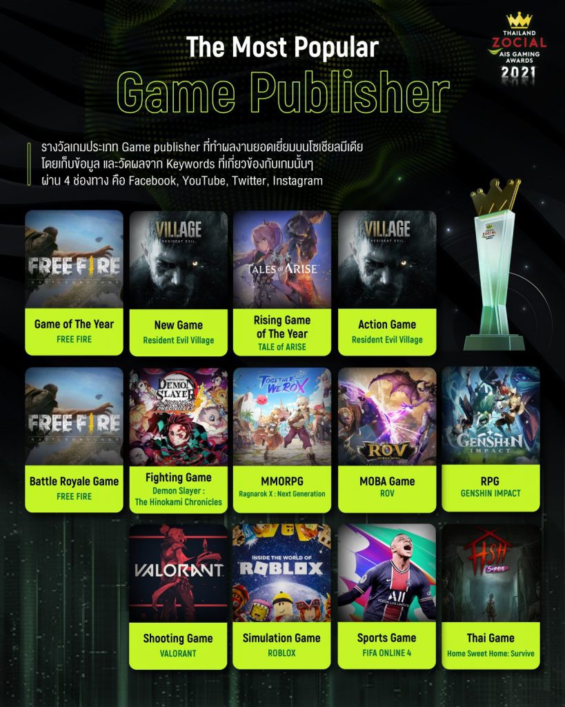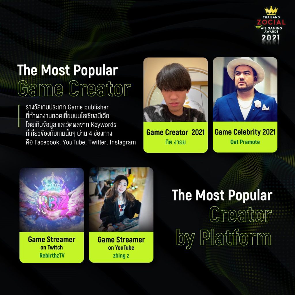 ติดตามรายละเอียดเพิ่มเติมเกี่ยวกับผลการประกาศรางวัล Thailand Zocial AIS Gaming Awards 2021 ได้ที่ https://www.ais.th/game/gameawards/