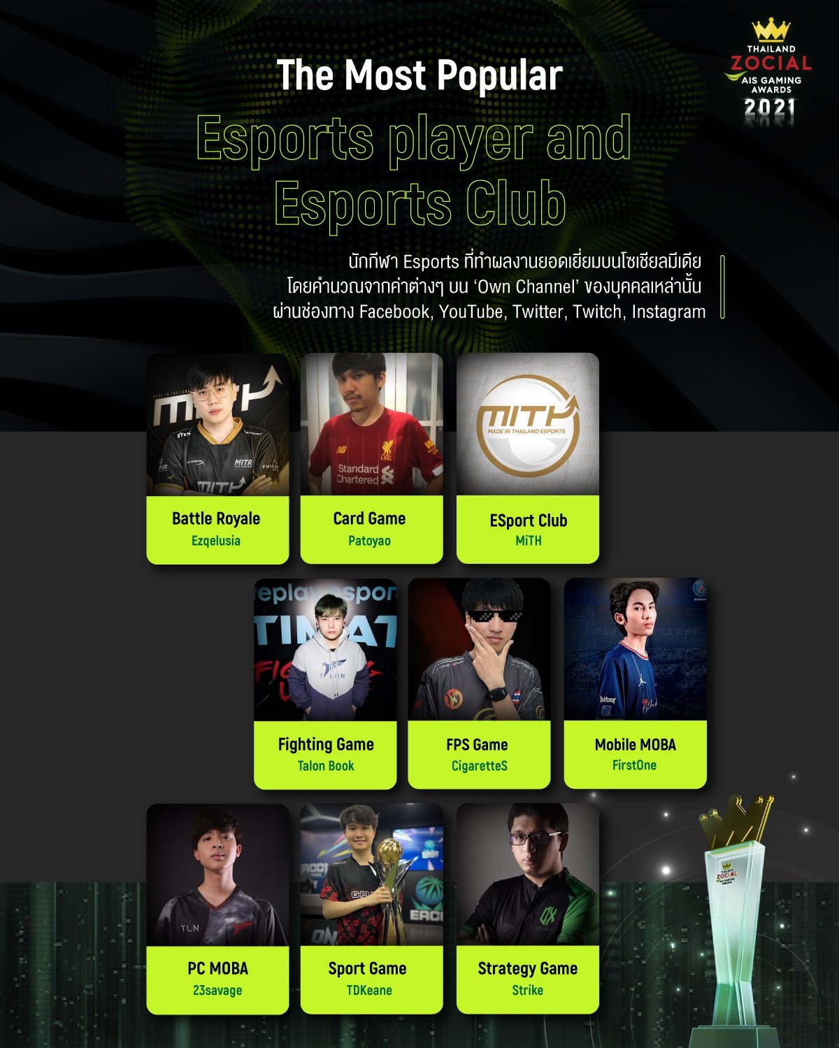 สื่อกลางในการสนับสนุนให้วงการอีสปอร์ตไทยมีเวทีในการแข่งขัน ซึ่งจากสถานการณ์โควิด-19 ที่ผ่านมาพบว่ามีเหล่าเกมเมอร์เข้ามาสร้างคอนเทนต์อย่างหลากหลาย โดยเฉพาะในปี 2021 พบว่าประเทศไทยมีผู้เล่นเกมมากถึง 32 ล้านคน เพื่อเป็นขานรับกระแสของอุตสาหกรรมดังกล่าวที่เติบโตอย่างก้าวกระโดดและเน้นย้ำถึงการเดินหน้าสนับสนุนอีสปอร์ต อีโคซิสเต็ม ล่าสุดได้ร่วมมือกับ ไวซ์ไซท์ ผู้ให้บริการด้านการวิเคราะห์ข้อมูลโซเชียลอันดับ 1 ในประเทศไทย ประกาศรางวัล Thailand Zocial AIS Gaming Awardsครั้งที่ 2 เพื่อร่วมกันเชิดชู และสร้างแรงบันดาลใจให้กับผู้ที่ทำผลงานบนโซเชียลมีเดียยอดเยี่ยมในด้านเกมและอีสปอร์ตตลอดปีที่ผ่านมา โดยความพิเศษในครั้งนี้ถือเป็นงานประกาศรางวัลของวงการเกมและอีสปอร์ตที่ยิ่งใหญ่ที่สุดในประเทศไทย ที่รวบรวมเหล่าผู้ที่สร้างสรรค์ผลงานยอดเยี่ยมในวงการเกมและ อีสปอร์ตไว้มากที่สุดซึ่งถือเป็นฟันเฟืองที่สำคัญในการสร้างอุตสาหกรรมอีสปอร์ตไทยให้เป็นที่ยอมรับทั้งในระดับประเทศและระดับสากล