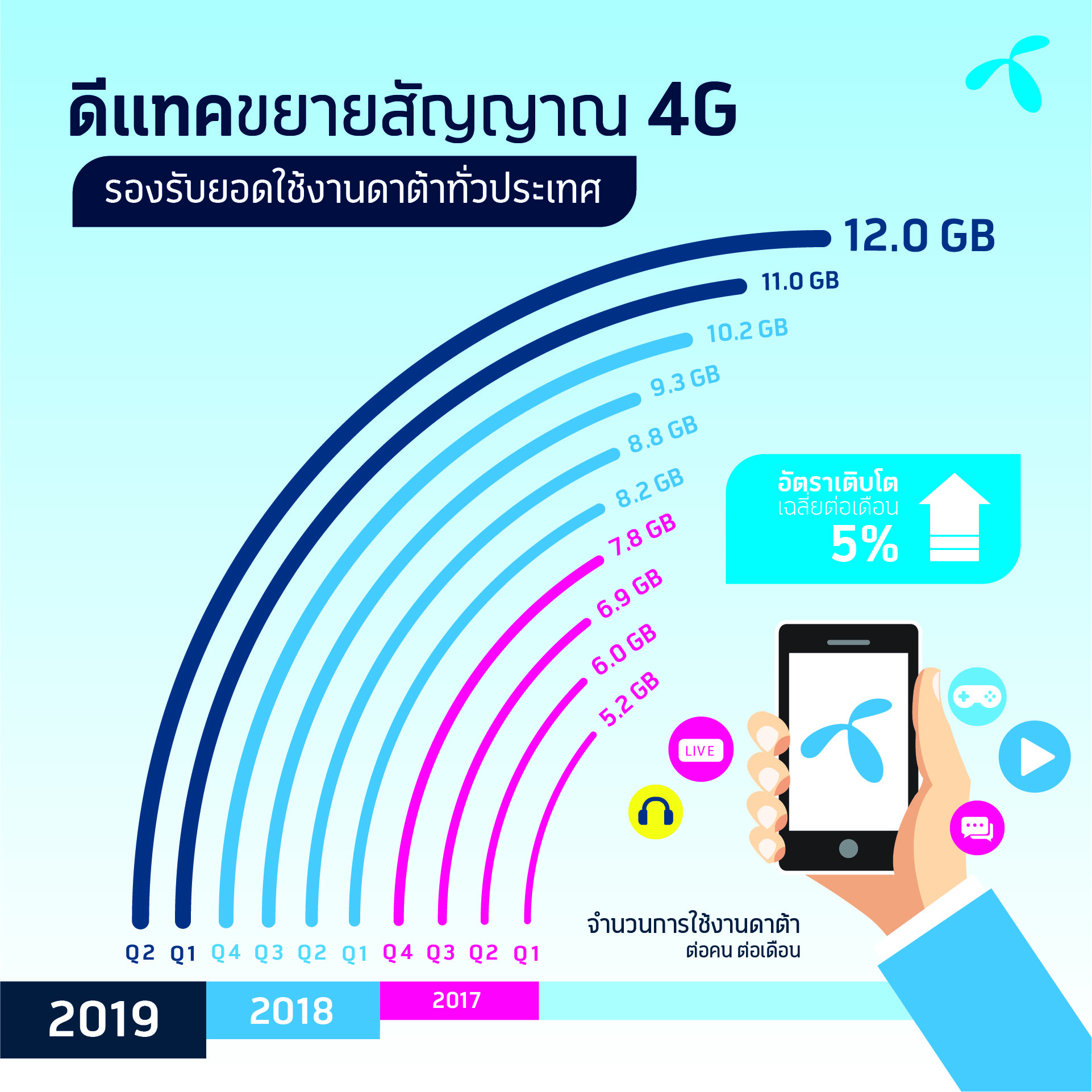 นายประเทศ ตันกุรานันท์ รองประธานเจ้าหน้าที่บริหารกลุ่มเทคโนโลยี บริษัท โทเทิ่ล แอ็คเซ็ส คอมมูนิเคชั่น จำกัด (มหาชน) หรือดีแทค กล่าวว่า “ในช่วง 1 ปีที่ผ่านมาดีแทคเร่งพัฒนาสถานีฐานทุกคลื่นความถี่ทั่วไทยอย่างเต็มที่ รองรับการใช้งานอินเทอร์เน็ตบนมือถือของลูกค้าที่เพิ่มขึ้นอยู่ที่ประมาณ 400-500 เมกะไบต์ ต่อคนต่อวัน โดยดีแทคขยายสถานีฐานจากทุกคลื่นความถี่ได้เร็วกว่าจำนวนอัตราการเติบโตของสถานีฐานในประเทศไทยประมาณ 2 เท่า ซึ่งถือว่าเร็วที่สุดจากที่ดีแทคได้ดำเนินการขยายสถานีฐานตลอดมา ทั้งนี้ พิสูจน์ได้จากผลสำรวจความพึงพอใจของลูกค้าดีแทค (Net Promoter Score - NPS) ที่มีต่อประสบการณ์การใช้งานบนโครงข่ายดีแทคในเดือนกรกฎาคม พ.ศ. 2562เพิ่มขึ้นจากเดิม 2 เท่าเช่นกัน ซึ่งเป็นสัญญาณที่ดีจากการพัฒนาทุกด้านของดีแทค”