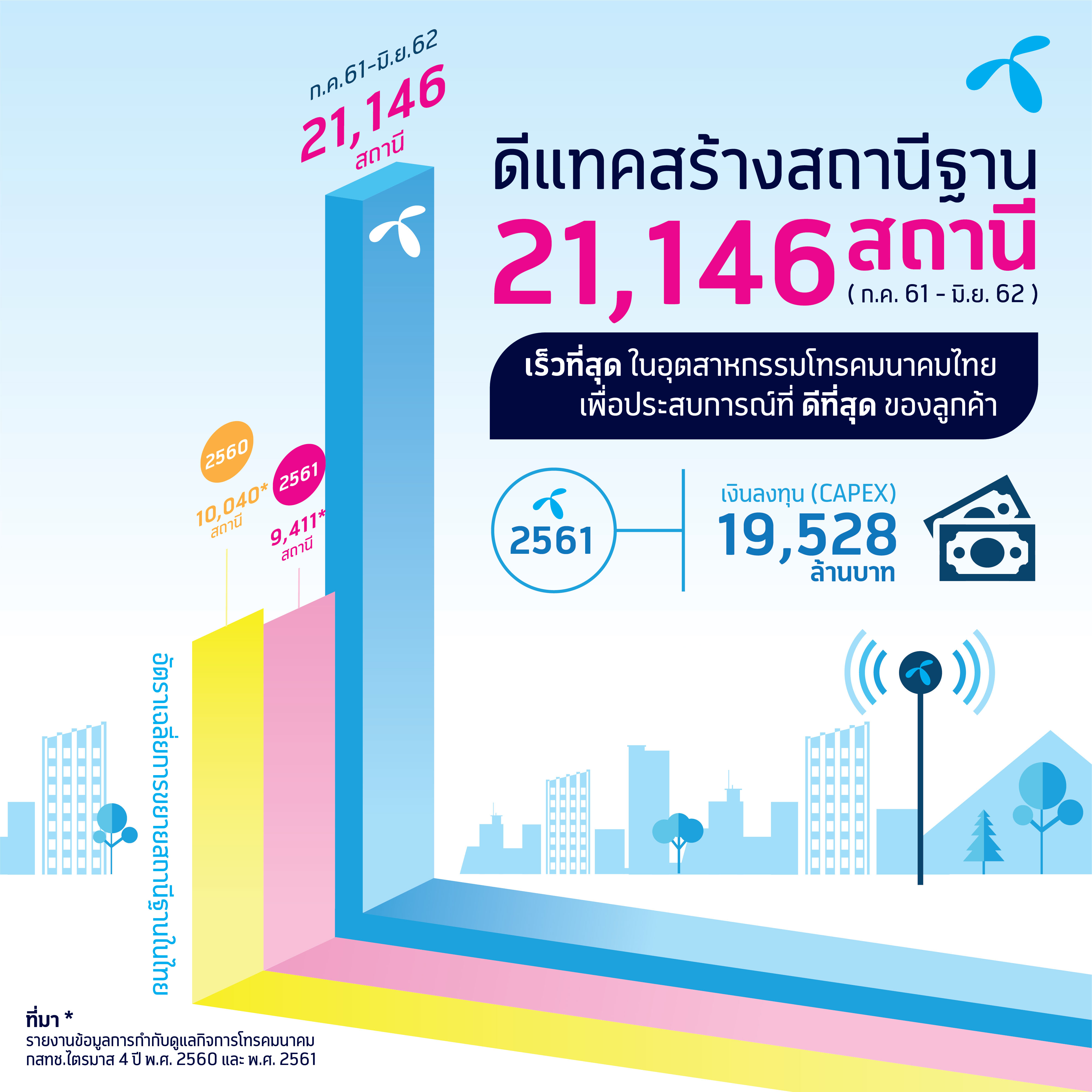 ดีแทคพัฒนาโครงข่ายไม่หยุด สร้างสถิติเร็วที่สุดขยายสถานีฐานทุกคลื่นรวมกันมากถึง 21,146 สถานีในปีเดียว (ก.ค. 61-มิ.ย. 62) เร็วที่สุดในอุตสาหกรรมโทรคมนาคมไทย ทั้งนี้ เมื่อเทียบกับรายงานข้อมูลจำนวนสถานีฐานในรายงานข้อมูลการกำกับดูแลกิจการโทรคมนาคม กสทช. ไตรมาส 4 ปี พ.ศ. 2560 และ พ.ศ. 2561 ของทุกเครือข่ายและทุกความถี่เฉลี่ย เท่ากับ 10,040 สถานี และ 9,411 สถานีฐานต่อปีตามลำดับ (ที่มา:  https://bit.ly/2KupUKQ และ  https://bit.ly/2M0zaII )