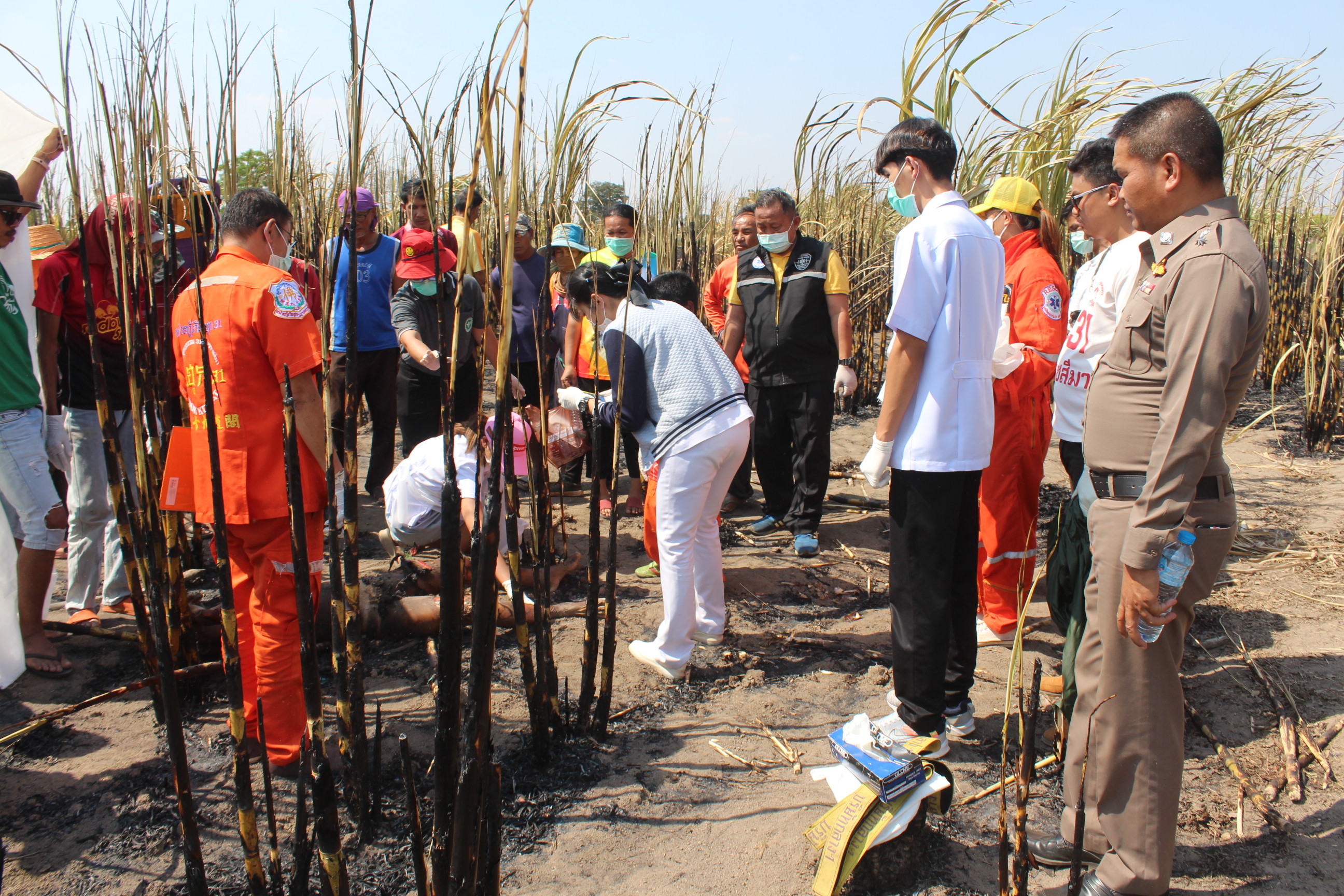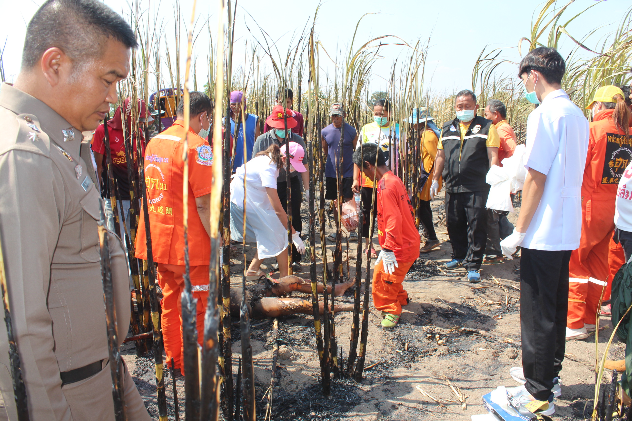โดยที่เกิดเหตุเป็นไร่อ้อยของชาวบ้านที่ถูกไฟเผาได้รับความเสียหายทั้งแปลงประมาณ 5 ไร่ พบศพชายทราบชื่อภายหลังคือนายสงวน เวชยันต์ อายุ 83 ปี อยู่บ้านเลขที่ 12 หมู่ที่ 3 ต.สระว่านพระยา อ.ครบุรี จ.นครราชสีมา ซึ่งเป็นอดีตกำนันตำบลสระว่านพระยา  นอนเสียชีวิตอยู่ริมไร่อ้อยในสภาพถูกไฟคลอกจนเกรียมทั้งร่าง