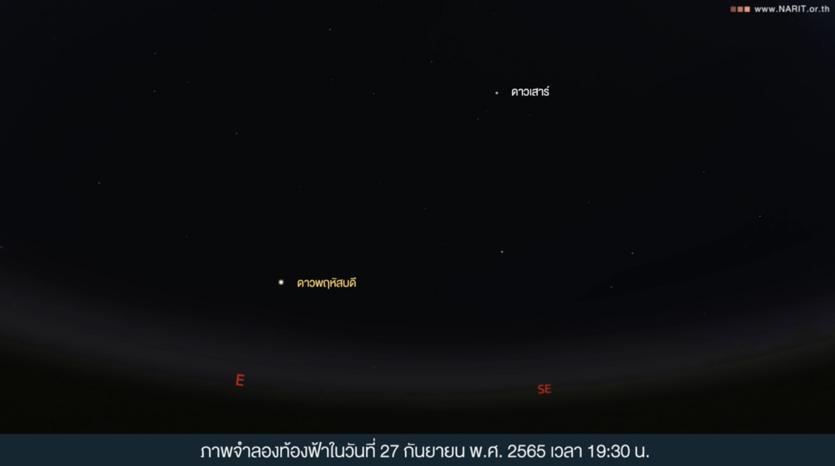 สถาบันวิจัยดาราศาสตร์แห่งชาติ (องค์การมหาชน) (สดร.) กระทรวงการอุดมศึกษา วิทยาศาสตร์ วิจัยและนวัตกรรม (อว.) เผย 27 กันยายนนี้ ดาวพฤหัสบดีใกล้โลกที่สุดในรอบ 59 ปี ปรากฏสว่างมากทางทิศตะวันออก ดูได้ด้วยตาเปล่ายาวนานตลอดคืนจนถึงรุ่งเช้า หากสังเกตผ่านกล้องโทรทรรศน์ ขนาดเส้นผ่านศูนย์กลาง 4 นิ้ว และมีกำลังขยายตั้งแต่ 30 เท่าขึ้นไป จะเห็นแถบเมฆบนดาวพฤหัสบดี และดวงจันทร์กาลิเลียนได้อย่างชัดเจน เตรียมตั้งกล้องชวนคนไทยส่องดาวพฤหัสบดีใกล้โลก 4 จุดสังเกตการณ์หลัก เชียงใหม่ นครราชสีมา ฉะเชิงเทรา สงขลา ฟรี! ไม่มีค่าใช้จ่าย