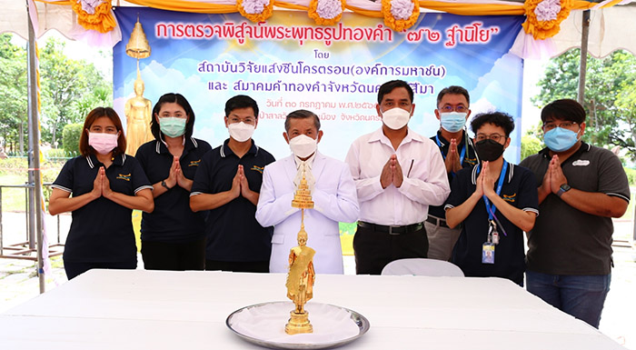 วันนี้ (15 ส.ค.) รศ.ดร.สาโรช รุจิรวรรธน์ ผู้อำนวยการสถาบันวิจัยแสงซินโครตรอน เปิดเผยว่า คณะนักวิทยาศาสตร์ของสถาบันฯ ได้นำเครื่องวิเคราะห์ทางวิทยาศาสตร์แบบพกพา พิสูจน์พระพุทธรูปปางห้ามญาติ นามว่า “72 พรรษาฐานิโย ภิกขุ (พุธอินหา)” ซึ่งเป็นพระพุทธรูปทองคำน้ำหนัก 3.5 กิโลกรัม ที่ศิษยานุศิษย์พระราชสังวรญาณ (พุธ ฐานิโย)อดีตเจ้าอาวาสวัดป่าสาลวัน ต.ในเมือง อ.เมือง จ.นครราชสีมาได้รวบรวมทองคำเพื่อหล่อและจัดสร้างพระพุทธรูปเมื่อวันที่ 7 กุมภาพันธ์ 2536 เพื่อถวายแก่อดีตเจ้าอาวาสวัดป่าสาลวัน หลวงพ่อพุธ ฐานิโย มีความประสงค์จะให้พระพุทธรูปองค์นี้เป็นสมบัติของชาวนครราชสีมา โดยปัจจุบันศิษยานุศิษย์นำโดยเจ้าคณะจังหวัด (ธ) พระราชวชิราลังการ วิ. (คำปอน สุทธิญาโน)มีความประสงค์นำองค์พระพุทธรูปไปตั้งประดิษฐานเพื่อให้พุทธศาสนิกชนและผู้มีจิตศรัทธากราบไหว้สักการะ ณวัดป่าสาลวัน ทางจังหวัดนครราชสีมาจึงขอความอนุเคราะห์สถาบันวิจัยแสงซินโครตรอนช่วยตรวจสอบองค์ประกอบในพระพุทธรูปเนื่องจากสถาบันฯ มีเครื่องมือที่สามารถตรวจสอบได้
