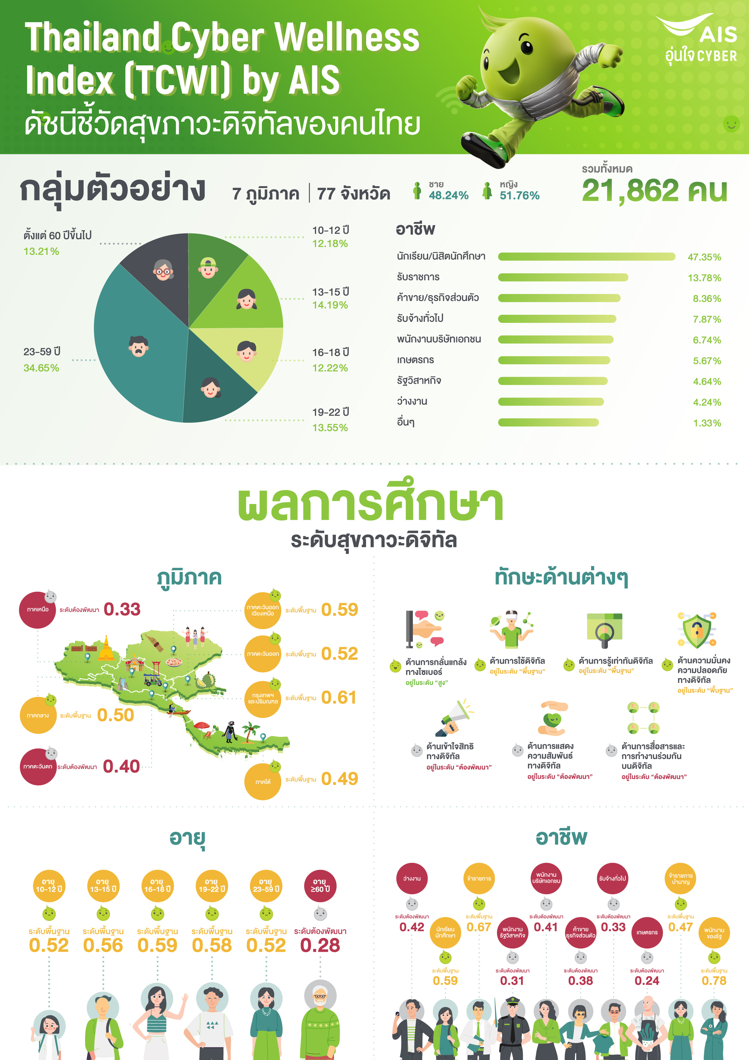 จากภารกิจหลัก AIS อุ่นใจ CYBER ที่มีทักษะสร้างด้านดิจิทัลและเพื่อส่งมอบบริการที่จำเป็นและเครื่องมือป้องกันให้กับคนไทยที่มาพบกับกลุ่มเป้าหมายได้ยกระดับการทำงานขึ้นไปอีกขั้นด้วยการสร้างมาตรวัดทางดิจิทัล ขึ้นเป็นกระจกส่องทักษะให้กับ ดัชนีชี้วัดสุขภาวะดิจิทัล Thailand Cyber Wellness Index (TCWI) ซึ่งมาพร้อมกับแหล่งที่มาของมหาวิทยาลัยเทคโนโลยีพระจอมเกล้าธนบุรี และจากทั้งด้านเทคโนโลยี ด้านสเปซ และสรุปผลการวิจัยเมื่อต้องใช้ดัชนีชี้วัด วัดสุขภาวะของดิจิทัลให้เป็นไปตามมาตรฐานที่จำเป็นและแม่นยำตรงกลุ่มเป้าหมายจะเป็นมาตรฐานใหม่ ซึ่งจะได้รับดิจิทัลให้กับชุมชนและการใช้งานด้านสังคม ดิจิทัลที่ดียิ่งต้องใช้ซอสให้ได้ รับดัชนีนี้ในเครือข่ายนี้ เพื่อป้องกันทางของสิ่งเหล่านี้ให้กับคนไทยทุกกลุ่มต่อไป