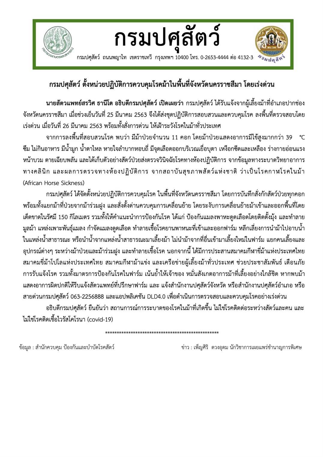 ปศุสัตว์พร้อมนายอำเภอปากช่องโคราช รุดลงพื้นที่ตรวจฟาร์มม้าแข่ง หลังตายปริศนามากถึง 42 ตัว ด้านอธิบดีกรมปศุสัตว์ยันเป็นโรคกาฬโรคแอฟริกาในม้า (African Horse Sickness) เพิ่งพบเป็นครั้งแรก ยันไม่ติดต่อกับคน