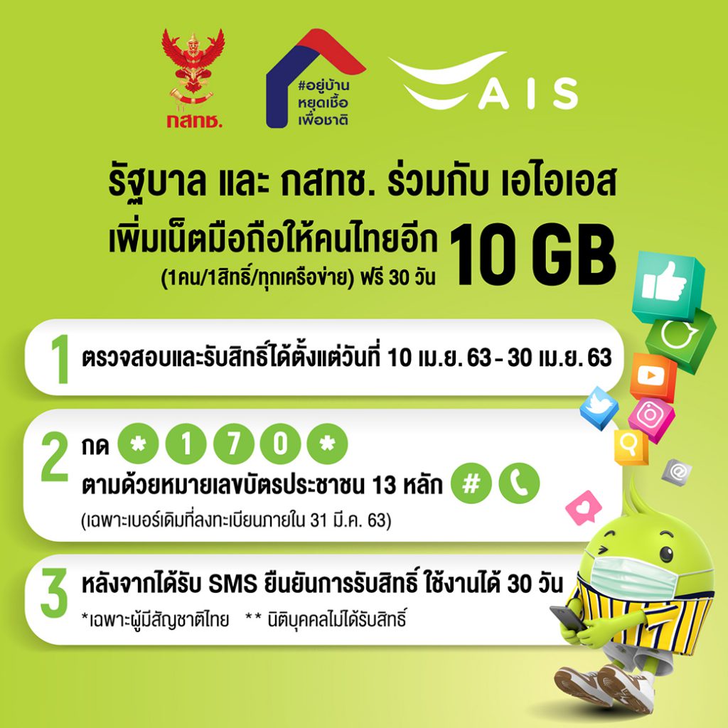 ลูกค้ามือถือเอไอเอสทั้งระบบรายเดือนและเติมเงิน ที่เบอร์มีสถานะการใช้งานปกติ (Active) โดยยกเว้น ลูกค้าระบบรายเดือนที่แพ็กเกจหลัก มีเน็ตใช้งาน =>10 GB หรือใช้เน็ตไม่จำกัด หรือ Nu Mobile สามารถลงทะเบียนรับเน็ต 10 GB ฟรี เพียงกด *170*หมายเลขประจำตัวประชาชน# แล้วกดโทรออก ตั้งแต่ 8.00 น. วันที่ 10 - 30 เมษายน 2563 และใช้งานเน็ตได้นาน 30 วัน หลังได้รับ SMS ยืนยัน โดยสงวนสิทธิ์ 1 คน /1 สิทธิ์ / ทุกเครือข่าย (กล่าวคือ ไม่ว่าจะถือหมายเลขโทรศัพท์กี่เบอร์กี่ค่ายก็จะได้รับเพียง 1 สิทธิ์ ตามกำหนดของ กสทช.) และต้องเป็นบุคคลธรรมดาสัญชาติไทยที่ลงทะเบียนซิมการ์ดด้วยหมายเลขประจำตัวประชาชนก่อนวันที่ 31 มีนาคม 2563