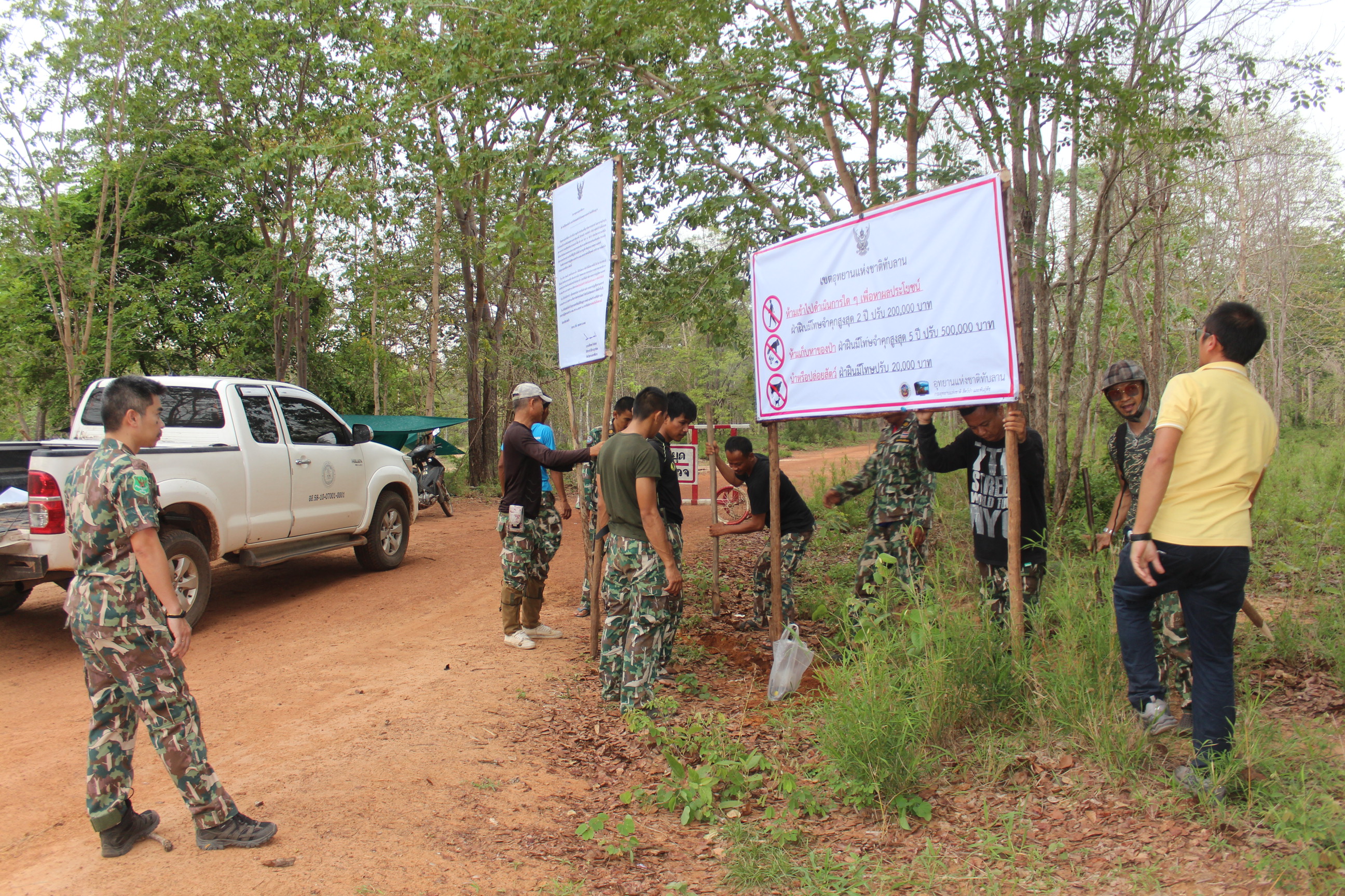 วันนี้ (19 พ.ค.63) นายคมสัน มณีกาญจน์ ผู้ช่วยอุทยานแห่งชาติทับลาน นำกำลังเจ้าหน้าที่พร้อมด้วยผู้นำชุมชน ออกติดตั้งป้ายประกาศห้ามไม่ให้ผู้ใดเข้าไปท่องเที่ยว เก็บหาของป่า และเลี้ยงสัตว์ในเขตพื้นที่อุทยานแห่งชาติทับลาน ท้องที่ตำบลจระเข้หิน อ.ครบุรี จ.นครราชสีมา อย่างเด็ดขาด ภายหลังจากที่เกิดมีเหตุการณ์พบซากกระทิงถูกชำแหละอยู่ภายในพื้นที่ป่าในท้องที่ตำบลจระเข้หิน อ.ครบุรี และรอยต่อระหว่างอำเภอวังน้ำเขียว ถึง 2 ตัว ในรอบ 1 เดือน และขณะนี้ทางเจ้าหน้าที่กำลังอยู่ระหว่างการติดตามหาตัวผู้ชำแหละมาดำเนินคดีตามกฎหมาย โดยทางเจ้าหน้าที่ได้นำป้ายประกาศไปติดตั้งไว้ภายในชุมชนที่อยู่ติดกับแนวเขตป่า และบริเวณแนวเขตอุทยานแห่งชาติทับลานท้องที่ตำบลจระเข้หิน จำนวน 3 จุด