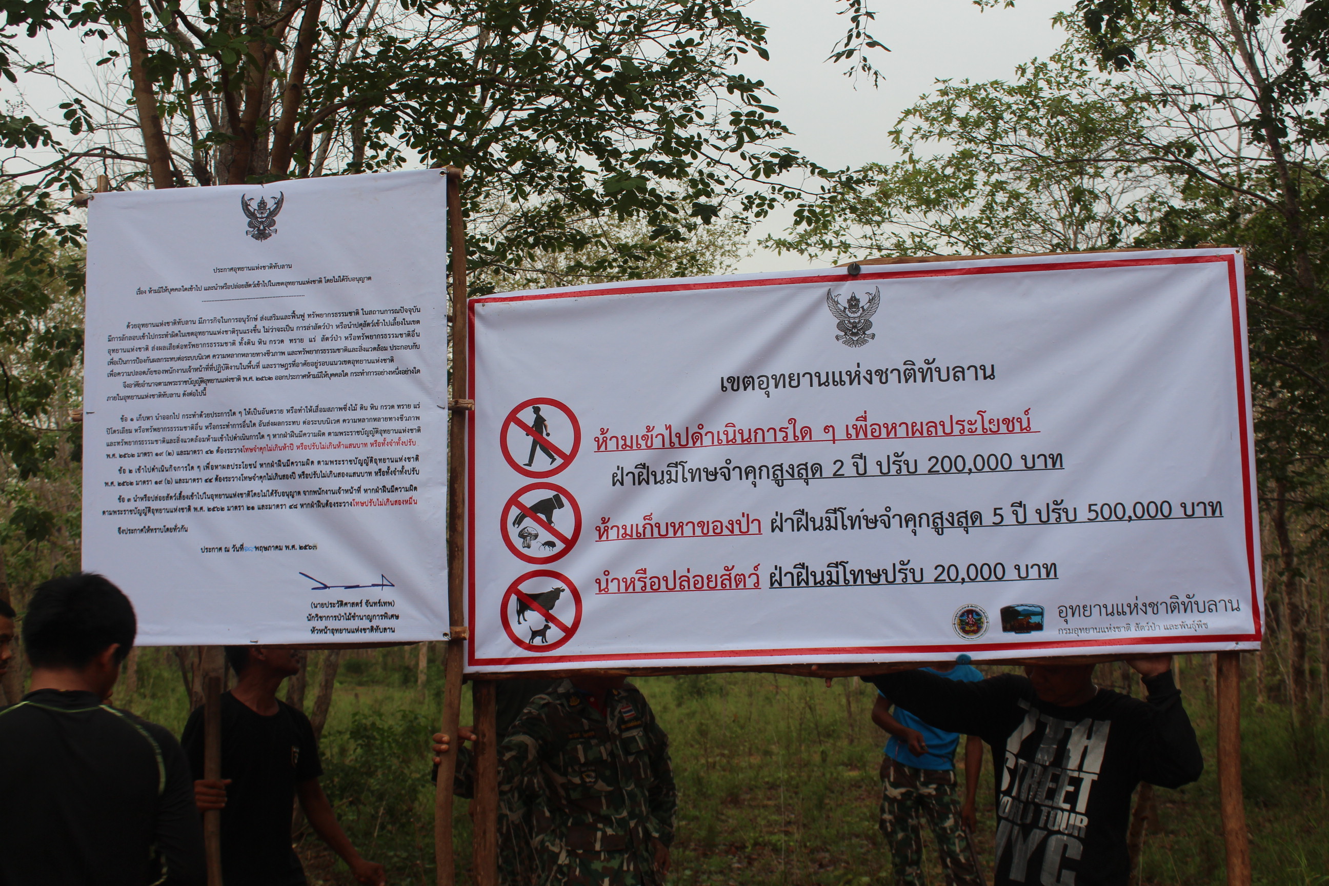 สำหรับการปิดป้ายประกาศห้ามเข้าเขตอุทยานแห่งชาติทับลานในท้องที่ตำบลจระเข้หิน อ.ครบุรี จ.นครราชสีมา เป็นคำสั่งโดยนายประวัติศาสตร์ จันทร์เทพ หัวหน้าอุทยานแห่งชาติทับลาน อาศัยอำนาจตามพระราชบัญญัติอุทยานแห่งชาติ เพื่อให้สามารถควบคุมและป้องกันการเกิดปัญหาขึ้นมาซ้ำอีก และให้เจ้าหน้าที่ได้ปฏิบัติหน้าที่ในการเฝ้าระวังและติดตามหาตัวผู้กระทำความผิดมาดำเนินคดีทางกฎหมายให้ได้โดยเร็ว และหากผู้ใดฝ่าฝืนทางเจ้าหน้าที่จะดำเนินคดีตามบทลงโทษสูงสุด