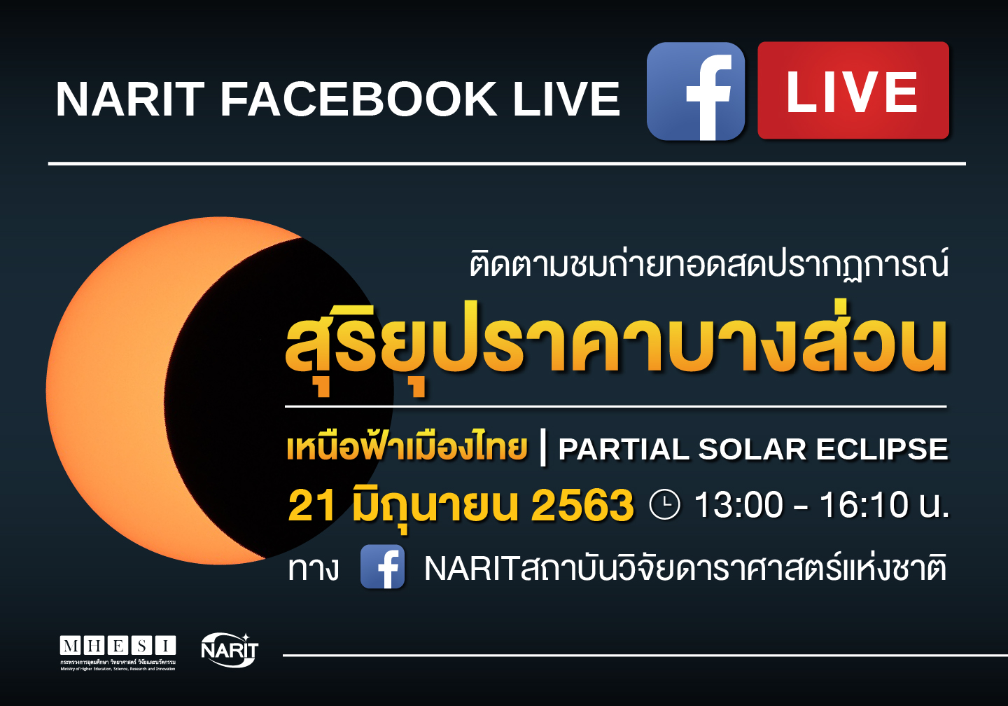 วันที่ 21 มิถุนายน 2563 นับเป็นโอกาสดีที่จะได้สังเกตปรากฏการณ์ดาราศาสตร์ทั้งสองในวันเดียวกัน ชมสุริยุปราคาบางส่วนเหนือฟ้าเมืองไทยในวันที่กลางวันยาวนานที่สุดในรอบปี สำหรับปรากฏการณ์สุริยุปราคาบางส่วน นอกจากจะสังเกตการณ์ได้เองผ่านอุปกรณ์กรองแสงอาทิตย์แล้ว ยังสามารถรับชมถ่ายทอดสดปรากฏการณ์ จาก 4 ภูมิภาค ได้แก่ ภาคเหนือ : อุทยานดาราศาสตร์สิรินธร อ. แม่ริม จ. เชียงใหม่ ภาคตะวันออกเฉียงเหนือ : หอดูดาวเฉลิมพระเกียรติฯ นครราชสีมา ภาคกลาง : หอดูดาว เฉลิมพระเกียรติฯ ฉะเชิงเทรา และ ภาคใต้ : หอดูดาวเฉลิมพระเกียรติฯ สงขลา ผ่านทางเพจเฟซบุ๊ก NARIT สถาบันวิจัยดาราศาสตร์แห่งชาติ www.facebook.com/NARITpage ตั้งแต่เวลา 13:00 - 16:10 น. นายศุภฤกษ์กล่าวปิดท้าย