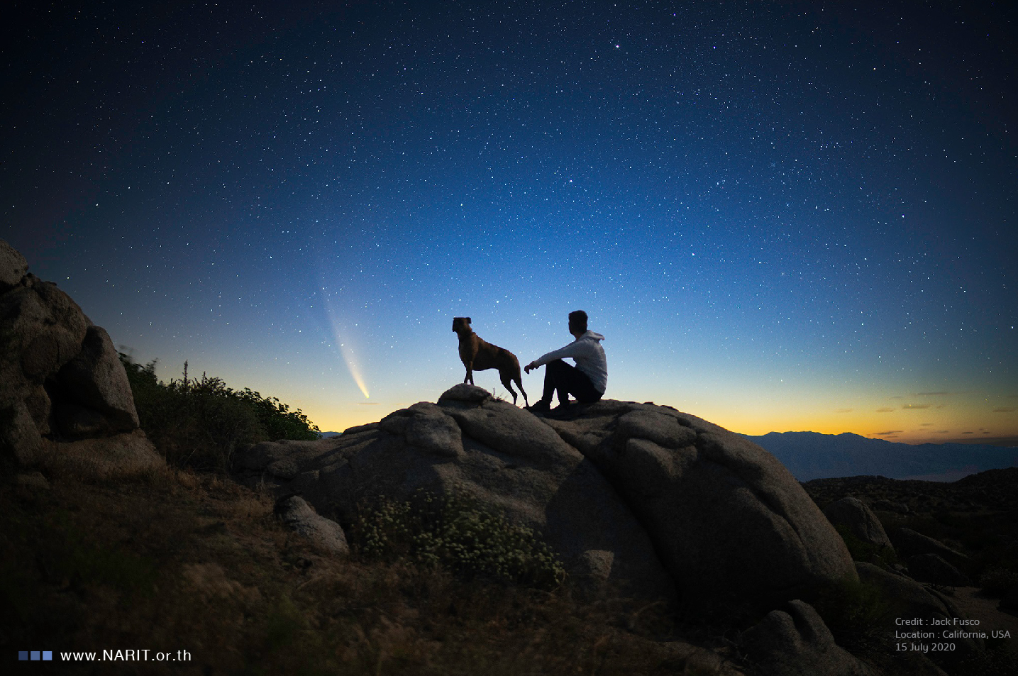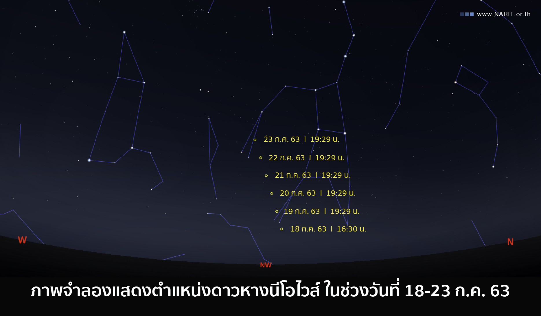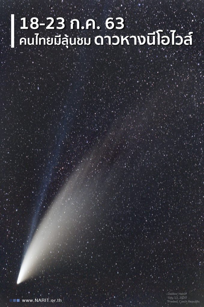 สถาบันวิจัยดาราศาสตร์แห่งชาติ (องค์การมหาชน) (สดร.) กระทรวงการอุดมศึกษา วิทยาศาสตร์ วิจัยและนวัตกรรม เผยคนไทยมีลุ้นชมดาวหางนีโอไวส์ ประมาณวันที่ 18-23 กรกฎาคม 2563 เนื่องจากโคจรออกห่างดวงอาทิตย์มากขึ้นและกำลังเข้าใกล้โลก อีกทั้งยังสว่างมากพอที่จะสังเกตได้ด้วยตาเปล่า ปรากฏในช่วงค่ำ ทางทิศตะวันตกเฉียงเหนือ ตั้งแต่ดวงอาทิตย์ตกถึงประมาณสามทุ่ม หากฟ้าใสไร้เมฆ ลุ้นชมด้วยตาเปล่าทุกภูมิภาคทั่วไทย