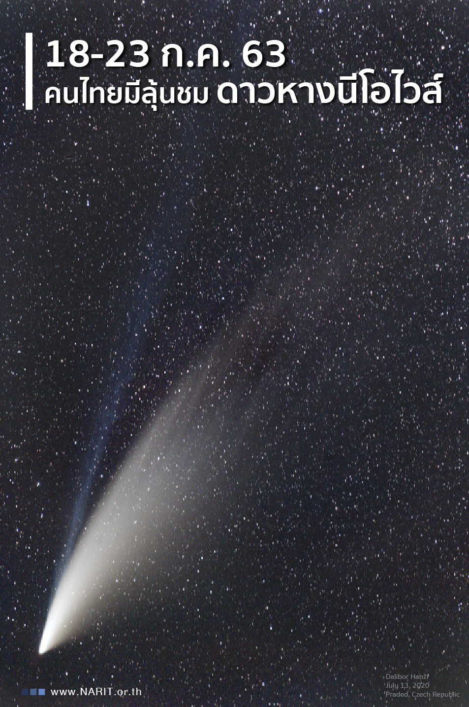 สำหรับชาวไทยที่สนใจชมและถ่ายภาพดาวหางดวงนี้ สามารถติดตามได้ในช่วงวันและเวลาดังกล่าว นอกจากนี้ วันอังคารที่ 21 กรกฎาคม 2563 ยังเป็นวันที่ดาวเสาร์โคจรมาใกล้โลกที่สุดในรอบปี สดร. จัดกิจกรรมสังเกตการณ์วงแหวนดาวเสาร์ในคืนใกล้โลกที่สุดในรอบปี 4 จุดสังเกตการณ์ ณ อุทยานดาราศาสตร์สิรินธร อ.แม่ริม จ.เชียงใหม่ หอดูดาวภูมิภาคนครราชสีมา ฉะเชิงเทรา และสงขลาตั้งแต่เวลา 18.00-22.00 น. จึงเป็นโอกาสดีที่จะได้ร่วมลุ้นชมดาวหางนีโอไวส์ ในวันดังกล่าวด้วย ผู้สนใจสามารถเข้าร่วมกิจกรรมได้ฟรี! ไม่มีค่าใช้จ่าย ติดตามรายละเอียดเพิ่มเติมได้ทาง www.facebook.com/NARITPage นายศุภฤกษ์ กล่าวปิดท้าย