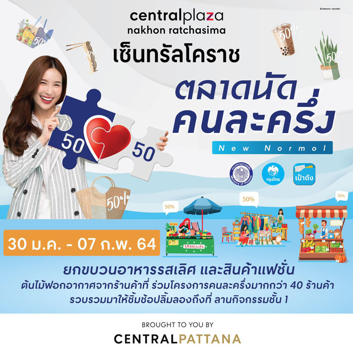 เซ็นทรัลพลาซา นครราชสีมา ขยายเวลา “ตลาดคนละครึ่ง เฟส 2” ต่อเนื่อง ร่วมส่งเสริมและสานต่อนโยบายภาครัฐ กระตุ้นเศรษฐกิจ นำร้านอาหาร ร้านค้าแฟชั่นสุดชิค ร้านต้นไม้ รวมมากกว่า 40 ร้าน มาให้ชาวโคราชชิมช้อปใช้ อาทิ อาหาร ขนมไทยโบราณ เครื่องดื่มน้ำผลไม้ เกี้ยวซ่า ยากิโซบะ ร้านเสื้อผ้าแฟชั่น และเอาใจคนรักต้นไม้ กับร้านต้นไม้ฟอกอากาศ ของตกแต่งสวนมีมาให้เลือกมากมาย ทั้งนี้สามารถใช้จ่ายในโครงการ “คนละครึ่ง”ได้ทุกร้านภายในงาน เพื่อช่วยเหลือพี่น้องประชาชน อีกทั้งราคาสินค้าต่างๆไม่แพงอีกด้วย ขยายเวลาเฟส 2 ถึงวันที่ 7 ก.พ. 64 ณ ลานกิจกรรม ชั้น 1 ศูนย์การค้าเซ็นทรัลพลาซา นครราชสีมา