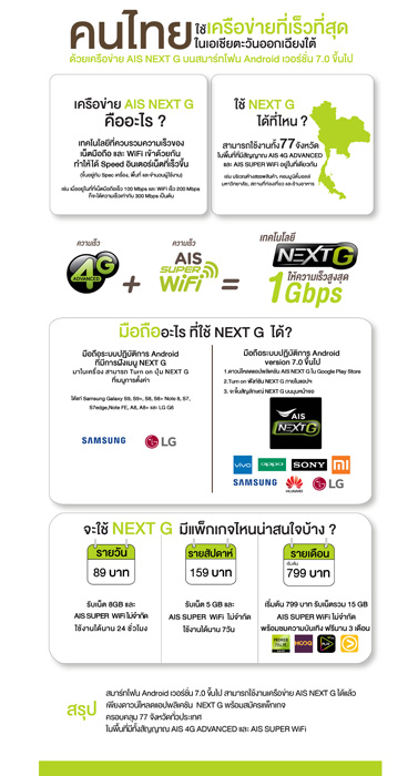 - ล่าสุด ประกาศขยายฐานผู้ใช้เครือข่าย AIS NEXT G สู่ลูกค้ากลุ่ม Mass ทั่วประเทศ ด้วย แอปพลิเคชันสุดล้ำ ‘NEXT G’ นวัตกรรมที่จะเปลี่ยนสมาร์ทโฟน Android กว่า 15 ล้านเครื่องในตลาด (ที่รองรับ Version 7.0 ขึ้นไป) ให้ใช้งานเครือข่าย AIS NEXT Gง่ายๆ เพียงดาวน์โหลดติดตั้งแอปฯ และสมัครแพ็กก็ใช้งานได้ทันที ชูขีดความสามารถของทีมงานที่เชี่ยวชาญด้านนวัตกรรมของเอไอเอส ที่สามารถออกแบบแอป ขึ้นใหม่ เพื่อคนไทย