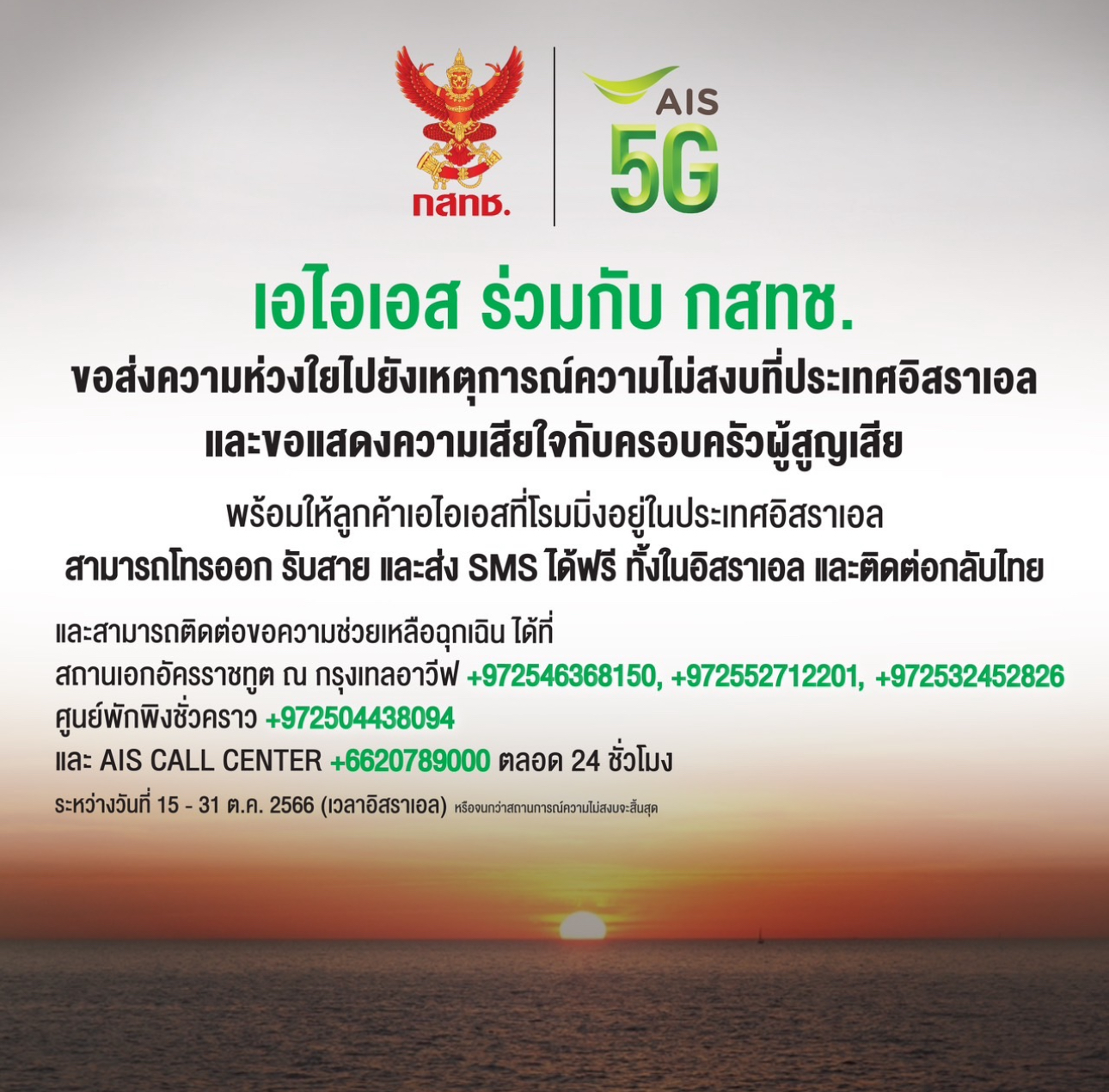 AIS เดินหน้าสนับสนุนระบบสื่อสารอย่างเต็มกำลังในภารกิจช่วยเหลือคนไทยที่อาศัยอยู่ในพื้นที่เสี่ยงภัยต่อเหตุการณ์ความรุนแรงในประเทศอิสราเอล หลังจากที่ก่อนหน้านี้ AIS ได้เร่งส่ง SMS แจ้งเตือนแสดงความห่วงใยให้กับลูกค้าที่ใช้บริการข้ามแดนอัตโนมัติ รวมถึงยังเปิดให้ลูกค้าสามารถโทรติดตามขอความช่วยเหลือฉุกเฉินจากสถานเอกอัครราชทูต ณ กรุงเทลอาวีฟ และ AIS Call Center ได้ฟรี นอกจากนี้ AIS ยังเข้าไปสนับสนุนการทำงานของรัฐบาลในภารกิจช่วยเหลืออพยพคนไทย ให้ทีมคณะทำงานสามารถติดต่อสื่อสารกับหน่วยงานที่เกี่ยวข้องได้อย่างราบรื่น อีกทั้งยังร่วมสนับสนุนภารกิจของกรมการกงสุล กระทรวงการต่างประเทศ ในการสื่อสารให้ประชาชนทราบสถานการณ์ข่าวสารที่มีความจำเป็นต่อการตัดสินใจและความปลอดภัยต่อการใช้ชีวิตผ่าน SMS และเพื่อเป็นการเชื่อมต่อ ช่วยเหลือ เพื่อคนไทย AIS ได้เพิ่มเติมมาตรการพร้อมอำนวยความสะดวกให้ลูกค้าที่ยังได้รับผลกระทบจากเหตุการณ์ความรุนแรงที่เกิดขึ้น โดยการเปิดบริการให้ลูกค้าสามารถโทร และส่ง SMS ภายในประเทศอิสราเอล และกลับมายังครอบครัวที่ประเทศไทยได้ฟรี