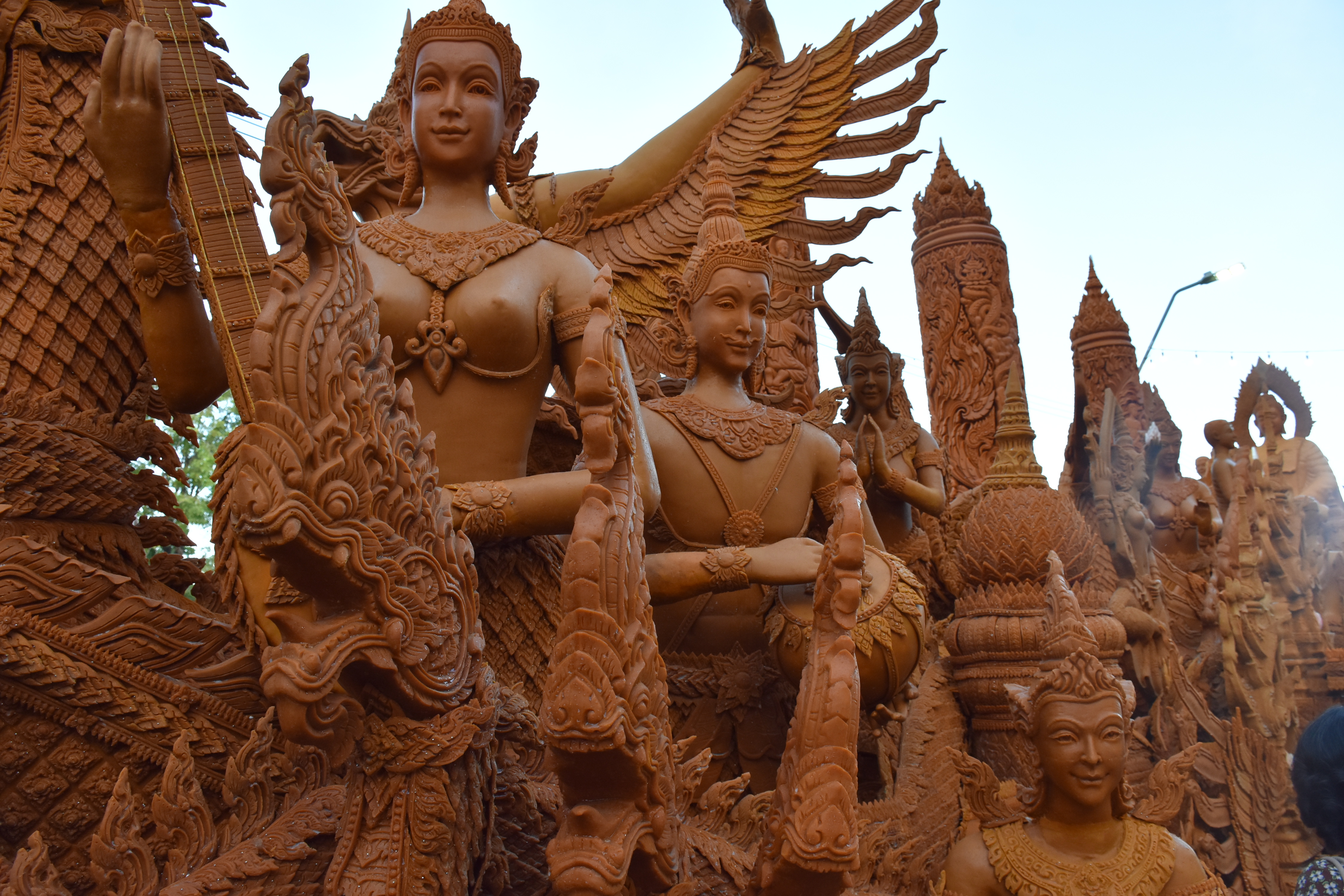 สำหรับบรรยากาศขบวนรถเทียนจากคุ้มวัดทั้ง 24 วัดได้ทยอยเข้าไปจอดโชว์ความสวยงามให้นักท่องเที่ยวได้ชม โดยภาพรวมปีนี้ขบวนเทียนพรรษาจากทุกคุ้มวัดต่าง ๆ ยังคงเน้นแกะสลักขบวนเทียนบอกเล่าเรื่องราวเกี่ยวกับพุทธประวัติ ซึ่งมีขบวนรถเทียนพรรษา และขบวนแห่เข้าร่วมการประกวด จำนวน 24 ขบวนเทียน อาทิ ขบวนเทียนจาก อ.พิมาย , อ.โชคชัย , อ.หนองบุญมาก , อ.โนนสูง และเขตเทศบาลนครนครราชสีมา เป็นต้น โดยขบวนเทียนที่สร้างความฮือฮาและได้รับการถ่ายภาพจากนักท่องเที่ยวจำนวนมาก คือ เทียนล้อการเมืองของวัดโพธิ์ ซึ่งปั้นรูปหล่อเทียนเป็นนักการเมือง ประกอบด้วย นายชวน หลีกภัย ประธานรัฐสภา, พล.อ.ประยุทธ์ จันทรโอชา นายกรัฐมนตรี นั่งหัวท้ายขบวนเรือ มี พล.อ.ประวิตร วงษ์สุวรรณ รองนายกรัฐมนตรีนั่งอยู่กลางเรือและทำท่าถือเบ็ดตกนาฬิกา นอกจากนี้ยังมีรูปปั้นเทียนเหมือนนายธนาธร จึงรุ่งเรืองกิจ หัวหน้าพรรคอนาคตใหม่ ที่เกาะกาบเรือของติดขบวนไปด้วย ใช้งบประมาณในการทำขบวนเทียนปีนี้กว่า 6 แสนบาท นอกจากนี้ยังมีเทียนรูปเหมือน ซุปตาร์อย่าง ตูน บอดี้แสลม หม่ำ จกม๊ก จินตราพูนลาภ และยังมีเทียนรูปเหมือน พระเทพวิทยาคม (หลวงพ่อคูณ ปริสุทโธ) อดีตเกจิอาจารย์ชื่อดังแห่งวัดบ้านไร่ ในขบวนเทียนของวัดหนองบัวรองด้วย