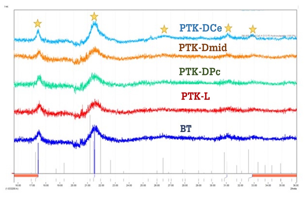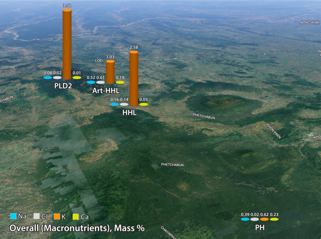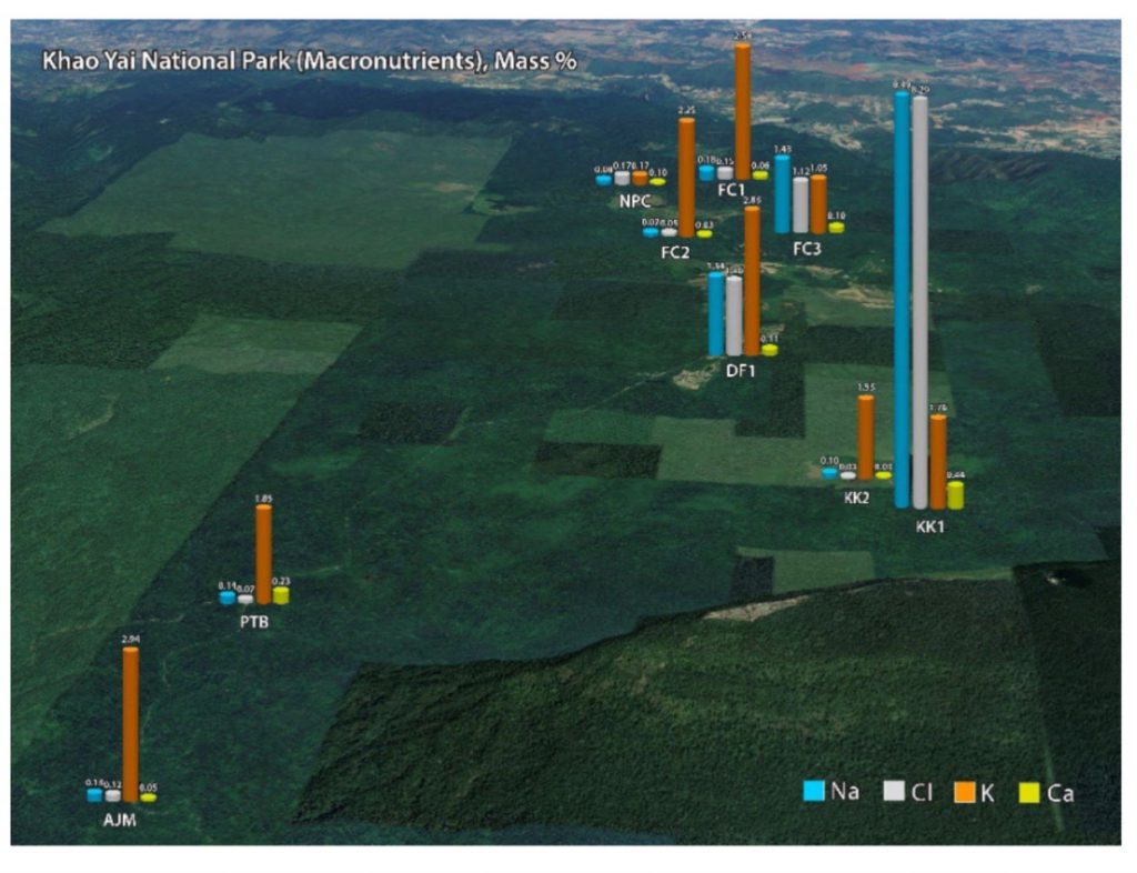 ส่วนผลการวิเคราะห์แร่ธาตุในดินโป่งแต่ละแหล่ง ด้วยเทคนิคการเรืองรังสีเอกซ์ (XRF) จากแสงซินโครตรอนและเครื่องมือในห้องปฏิบัติการ พบแร่ธาตุที่หลากหลายซึ่งมีความจำเป็นสำหรับช้างและสัตว์ป่าทั้งแร่ธาตุหลักและแร่ธาตุรอง ได้แก่ โพแทสเซียม แมกนีเซียม แคลเซียม โซเดียม เหล็ก แมงกานีส และสังกะสี ทั้งนี้ มีข้อสังเกตที่สำคัญคือ พบว่าธาตุแคลเซียมมีปริมาณน้อยเมื่อเทียบกับข้อมูลจากรายงานวิจัยที่เกี่ยวข้อง ซึ่งคาดว่าแร่ธาตุที่จำเป็นบางชนิดละลายได้ดีในน้ำ จึงถูกน้ำซะล้าง เจือจาง และช่างป่ายังไม่กินดินโป่งเนื่องจากมีกลิ่นนักท่องเที่ยวที่เข้าไปเหยียบย่ำโป่ง