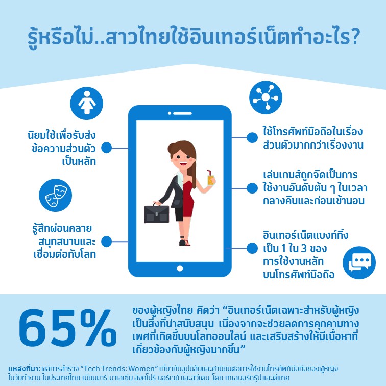 - ผู้หญิงไทยส่วนใหญ่สนับสนุน “อินเทอร์เน็ตเฉพาะสำหรับผู้หญิง” แตกต่างจากผู้หญิงสิงคโปร์ สวีเดน และนอร์เวย์